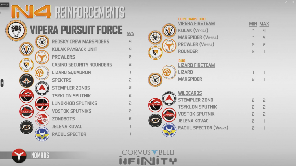 Genghis Cohen: Hmm, I love the Vidocq, and this Reinforcements roster has some nice existing units on it, including another AVA2 Wildcard sensor-bots appearance. I'm not seeing as much jump out at me in the way of big Fireteams as some other factions' lists though. I'd be keen to see how the characters fit into this, and if their reinf profiles change at all.