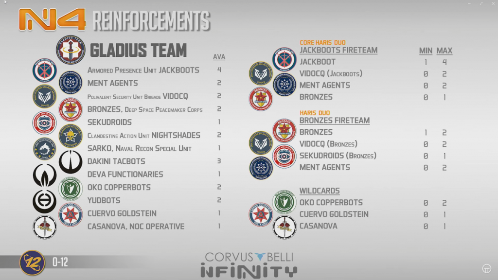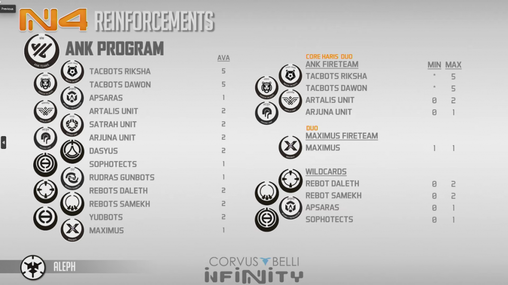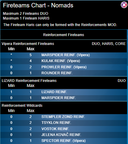 All of the Reinforcement rosters have Core, Haris and Duo Fireteam options. Players can deploy their Reinforcements formed into Fireteams, but must obey their Faction or Sectorial's normal limit on how many Fireteams are on the table. So if a Sectorial deployed a Core Fireteam in their Main Section, and that Fireteam is still intact when the Reinforcements are Requested, they could not deploy those Reinforcements as a second Core Fireteam. It is allowed to cancel the Main Section team, which the owning player can choose to do at any point, and then deploy a Core team as part of the Reinforcements. Players are explicitly forbidden from forming mixed Fireteams of Reinforcement and Main Section troopers, even by spending Command Tokens later in the game. All vanilla Factions have now been granted the right to have one Haris team, but only in Reinforcement games, and their only options to do so are Reinforcement teams.