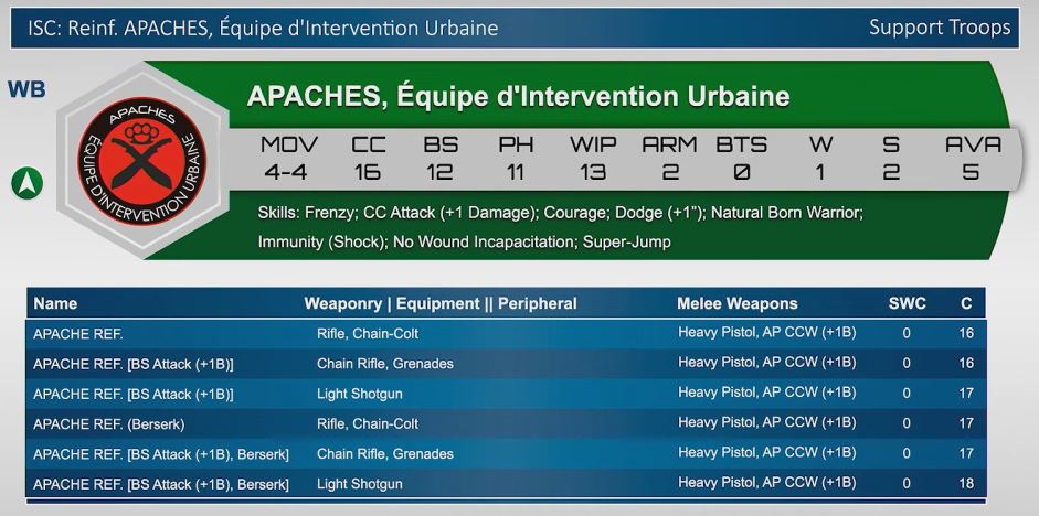 still love Apaches. They don't appear to be in Vanilla Ariadna (which is a mild but understandable shame) but they are AVA 2 Wildcards that count as Loup Garou in FRRM. A 6-2, Super Jump, NWI Warband that can either drop Burst 3 templates or make Burst 2 CC attacks for the bargain price of 17 points is very,