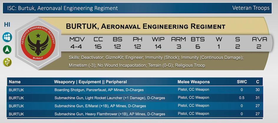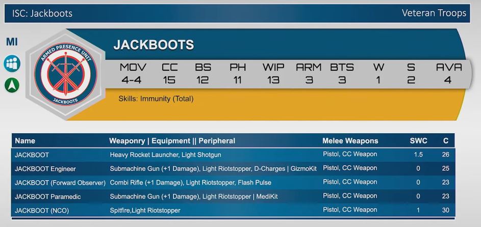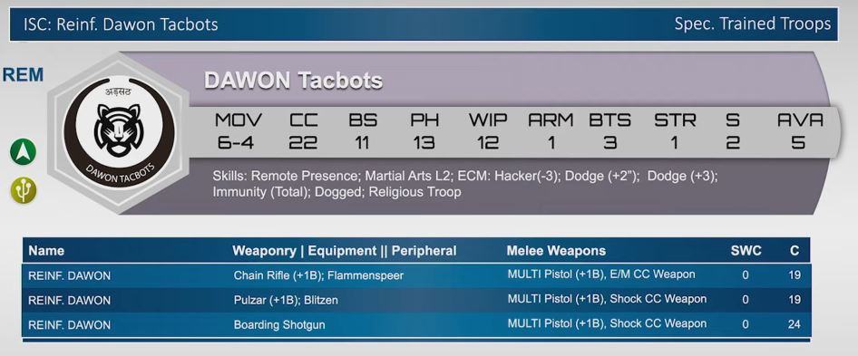 And what absolute units they are. It's mostly simply a straightforward bruiser HI. BS14 and ARM5, with mean SWC guns, at a reasonable price. With TacAware and fully usable in Fireteams no less! Especially as both profiles combine an >16" weapon with an assault pistol, creating an active turn unit that is dangerous at a variety of ranges. While you'd try taking one just for those qualities, it's also got a very interesting Guided ability on the 35pt HRL+1B. Now this won't be the death-dealing machine a conventional Guided missile bot is. It will probably be best used against lighter armoured units. But Guided is a great capability to have. It turns your hackers into existential threats against non-hackable units, so long as you have a couple of Orders. It's also really nice that the B3 weapon has a reason (beyond just cost) to take it over the usual HMG option. This is a unit I really look forward to trying out.