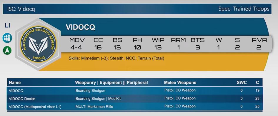 I was tempted to run 3x Dakini because 15 points for fast-mover specialists with Mimetism -3 is just wild but who can resist the lure of a Wild Parrot in the mid-field? Bring Cuervo for all of your Ultra-Violence needs and then round it out with a VIDOCQ NCO. Would love to bring the Multi-Marksman Rifle profile but the points aren't quite there.