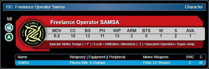 The new rogue Exrah merc, Freelance Operator Samsa, is available to all vanilla Factions except Combined Army in their Main Sections (he's a Reinforcement choice for NA2 armies). He's not bad - at 30pts for a 1W model with Infiltration and Mimetism-3, but no marker state, the problem will be his fragility, especially if playing second you may struggle to keep him alive. But if you can, or are playing first and happy to use him as a disposable attack piece, he's a BS13 plasma rifle that starts in the midfield, is a Spec Op for doing missions, and is highly mobile with 6-2MOV and Super-Jump. Far from an auto-take in most factions, but certainly very usable.