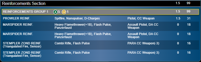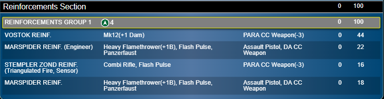 Reinforcements is an alternate game mode - so you would agree on its use before playing a game with a friend, and of course it would be advertised as part of a tournament. The standard size is advised to be 350pts/7SWC. This means each player writes a list of 250pts/5SWC as their 'Main Section' and a separate Combat Group of 100pts/2SWC which is the 'Reinforcements Section'. The latter is drawn from its own roster (a vanilla Faction and all its Sectorials share the same Reinforcements roster) of unique profiles - while many are the same models as the Main Section can take, these are all 'Reinf.' units, so for example the Nomads' Stempler Zond has different profiles to the Reinf. Stempler Zond. Both Sections must keep to the limit of having no more than 15 troopers in total. There's no limit on the number of Combat Groups, or number of models, in each Section (in practice, there's no reason to ever spread 100pts of Reinforcements over more than one group, and your Main Section will be 1-2 Combat Groups). Interestingly, the contents of your Reinforcements Section are open information once the game has begun - no ability to surprise your opponent with what you picked.