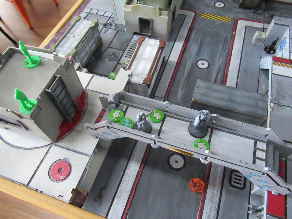 immense win for me! I didn't inflict so much as a single point of damage and I lost my piece to return fire but now my opponent's defense was absolutely shattered. He was absolutely relying on the threat of those camo tokens to provide ranged superiority and restrict my movement crossing the table and now there were a bunch of BS12 snipers sitting on rooftops just waiting to die. And die they did. The remainder of my turn involved moving the core link up into midfield and then engaging and killing every one of his overwatch pieces - all three Caterans, including successfully discovering the third, the missile launcher, and the Grey went down, utterly depriving my opponent of any sort of ranged firepower.