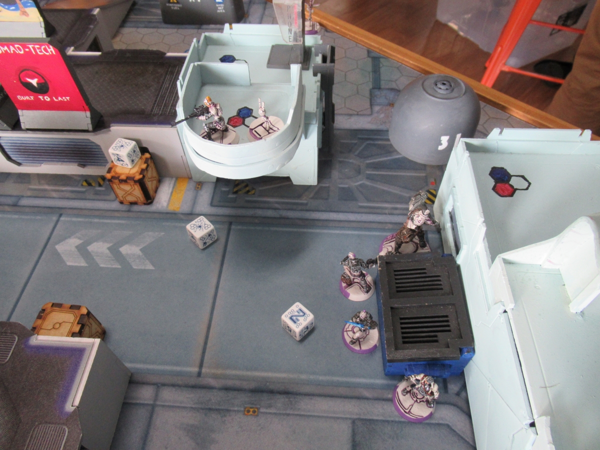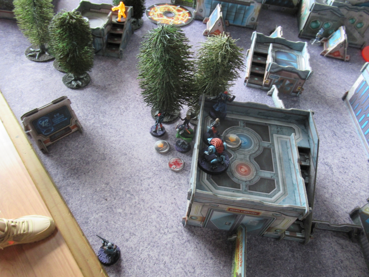 My first turn was just digging myself out of my deployment zone - a task that went very well despite moving all of four inches. I killed both snipers, Knauf with long range plasma fire from Hector and LeMeut with the total reaction bot - it took a wound from one of the panzerfaust Dalyami in the process but I super jumped Parvati up to fix it. And I've got to say, far more than any other feature Parvati has it's her super jump skill which absolutely changes games. That skill lets me place my total reaction remote in extremely weird places to maximize firing lines and still be pretty confident that she can flip up to it to slap a patch on. I manage to clear out the biker as well but overall I haven't really made any table progress.
