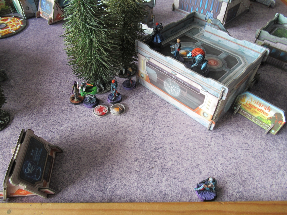 I think my opponent's biggest mistake was revealing both Cateran snipers to shoot the TR bot. It was a panic move and I sympathize because that thing had a bead on some extremely important targets but having those camo tokens as threats was his