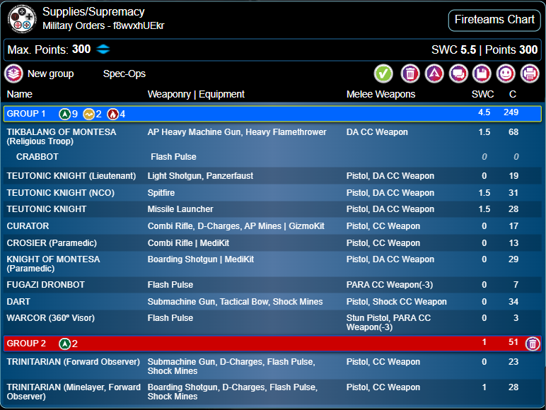 I basically wanted to use the same list I took last time for Biotechvore and Frostbyte. Those are very specific missions, but I thought that my relatively elite set-up would still be fine for dominating ground in Supremacy, and I had one great mission specialist for Supplies in the Montesa paramedic. Indeed the Crosier paramedic could also be dragged forward by the Teutons to score in that mission, and the Tikbalang’s Crab-bot pilot could try if it needed to and everything else was dead. I did make some small tweaks to previous experiences and the missions. I removed Mendoza for Dart and a Trinitarian Tertiary with SMG. I thought that ultimately Dart was nearly as effective a midfield killer, and with her Unhackable nature and MSV1, maybe a better complement to the Tikbalang. This let me have another model, more Hidden Deployment shenanigans and another specialist to cap objectives. Secondly, after much thought, I swapped the Trinitarian sniper for a boarding shotgun minelayer. I figured that capping the Supply Boxes, and scoring consoles or quadrants in Supremacy, would be the core aim of the games. As fun as a hidden sniper is, its role would be less important than those directly game-winning moves. I also wanted to throw some doubt onto which Mimetism-3 camouflage marker was Dart, but of course that is very unlikely against a savvy opponent. These changes did present a slight issue. Instead of a sneaky Hidden Deployment ARO in my second group, I now had two lonely Hidden Deployment mission specialists with no other orders to fuel them. I debated moving at least one into the first group, but eventually decided I should earmark 2 Command Tokens to move them if necessary, and that by deploying them next to Objectives, they would always be able to have one cheeky WIP roll to activate them at the point they revealed.