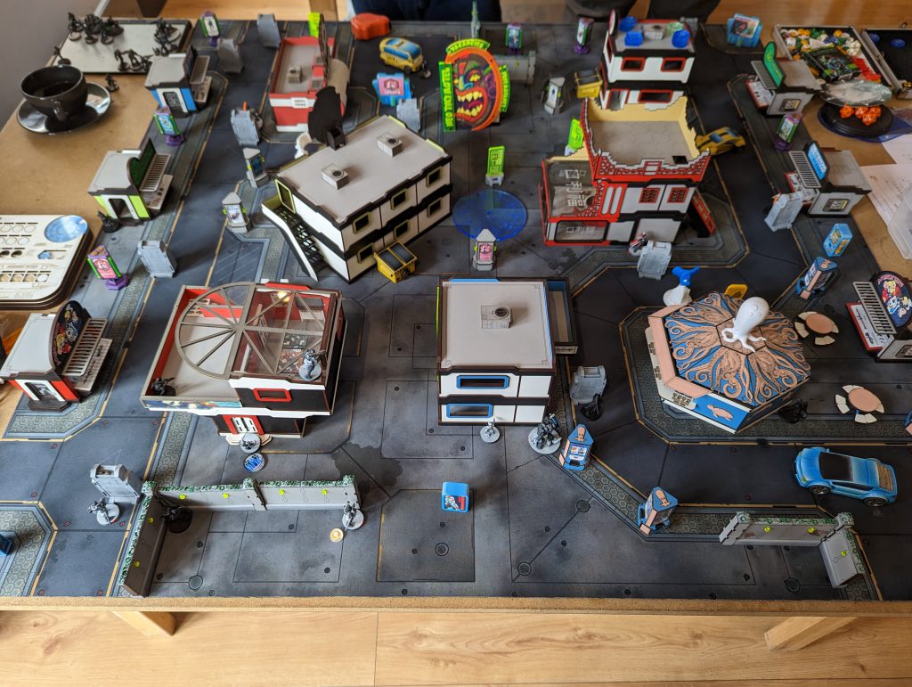 My opponent deployed a variant on the common meta Nomads stuff. He had the usual GML/Heckler combo, with Jazz and Zoe as his hackers and the ubiquitous pair of Moran Masai. He also had a Salyut EVO remote, some Morlocks, the Puppetmaster with 3 bots, and a Daktari. Unusually there was no Chimera and a Taskmaster was his only big direct gun, and I could see it was his only valid Lt. Now it was in a clump with the Vertigo and Salyut Zonds behind a big building on my left, so that was my main target.