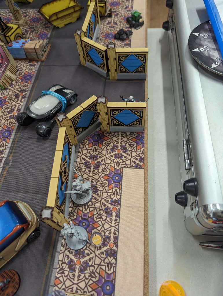 The table seen from my deployment zone. Haris and Core teams on the left, TR bot, Sophotect and Kuang Shi in the middle, Dakini Haris on the right.
