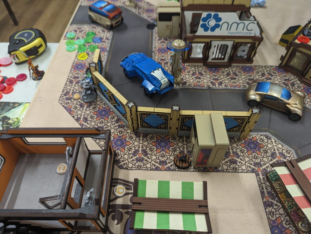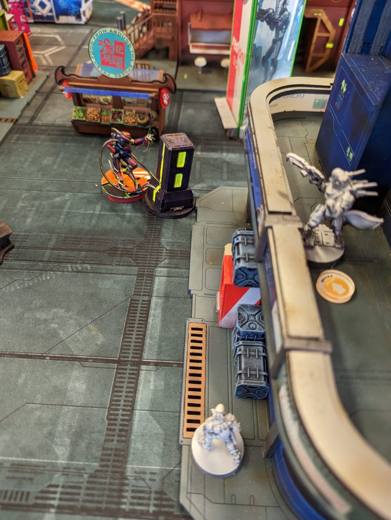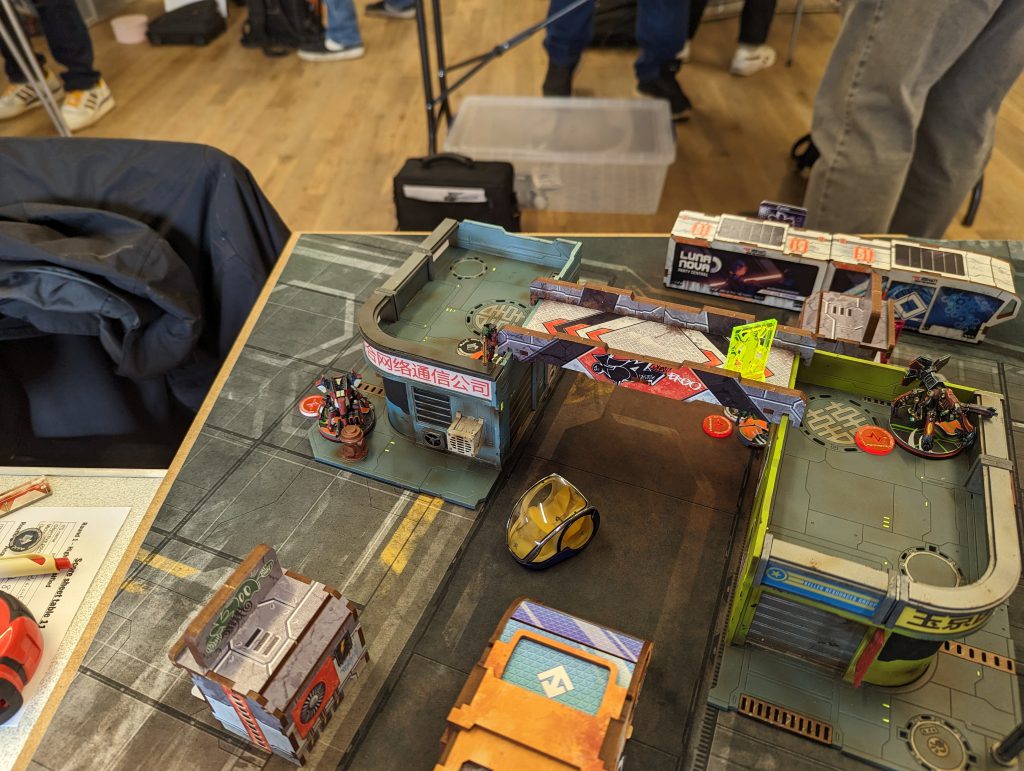 So I ended that pivotal first turn with my Zhanying and Xi Zhuang in fairly safe positions on my left flank, but had only secured one Classified objective. I could have tried Net Undermine and didn't, which was arguably a mistake but it's very easy and I expected to have further opportunities in later turns. My real errors were not identifying the killer hacker opportunity immediately, and executing it so poorly, and then overcommitting the Hsien Haris while not correctly prioritising the Classifieds. However I did have notably poor luck, if the FtF rolls in this turn had gone differently I would still have been in a much better position.
