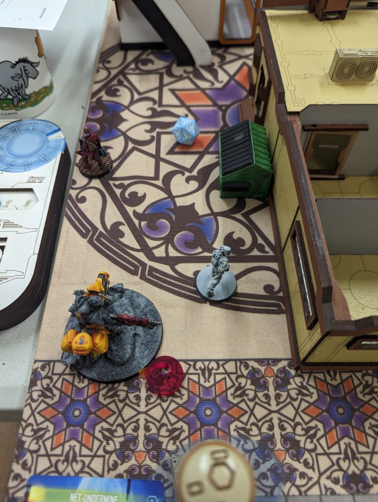 My Hsien Lt (left, Unconscious) after taking a crit in ARO. This also shows the sheltered position of my Zhanying hacker (Prone on the left) at the end of the turn.