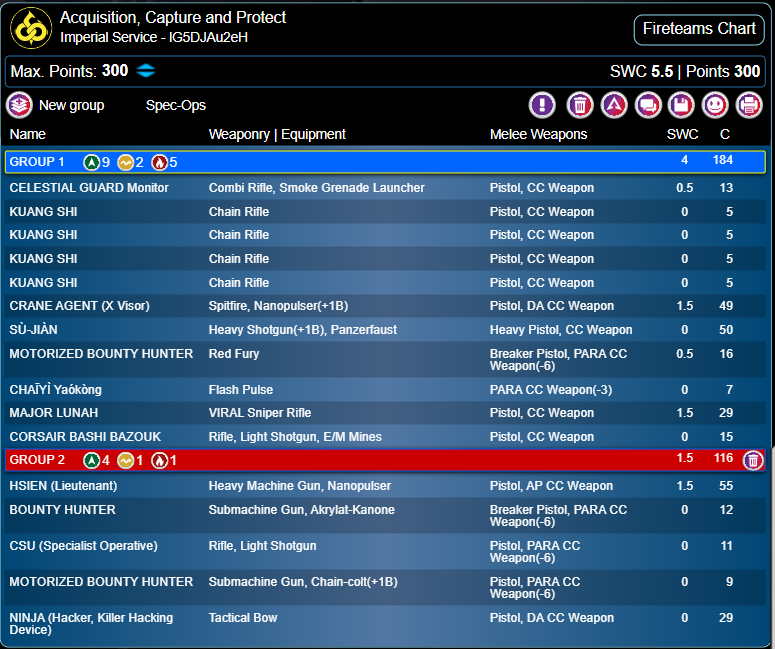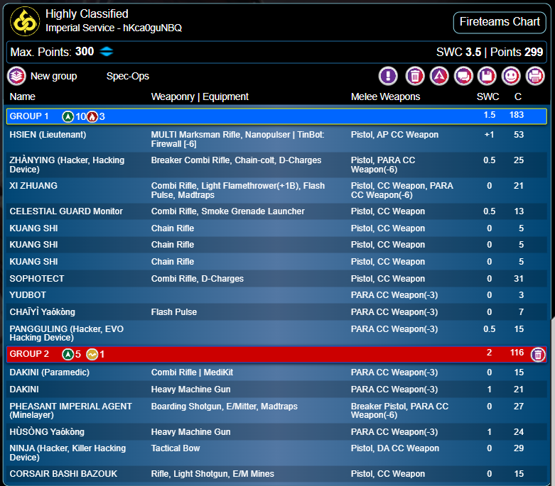 In line with taking White Company to the currently ongoing Infinity Global League on Tabletop Simulator, I decided to revisit Imperial Service Sectorial (ISS) for this event. It has been a couple years since I played them, and that was only for a couple games. They've had the Fireteam update since, which gave them some very interesting combinations, including the ability to take 2 Haris teams. I also could see some decent fits, as I thought, for the event's missions: Highly Classified, Acquisition, and Capture & Protect.