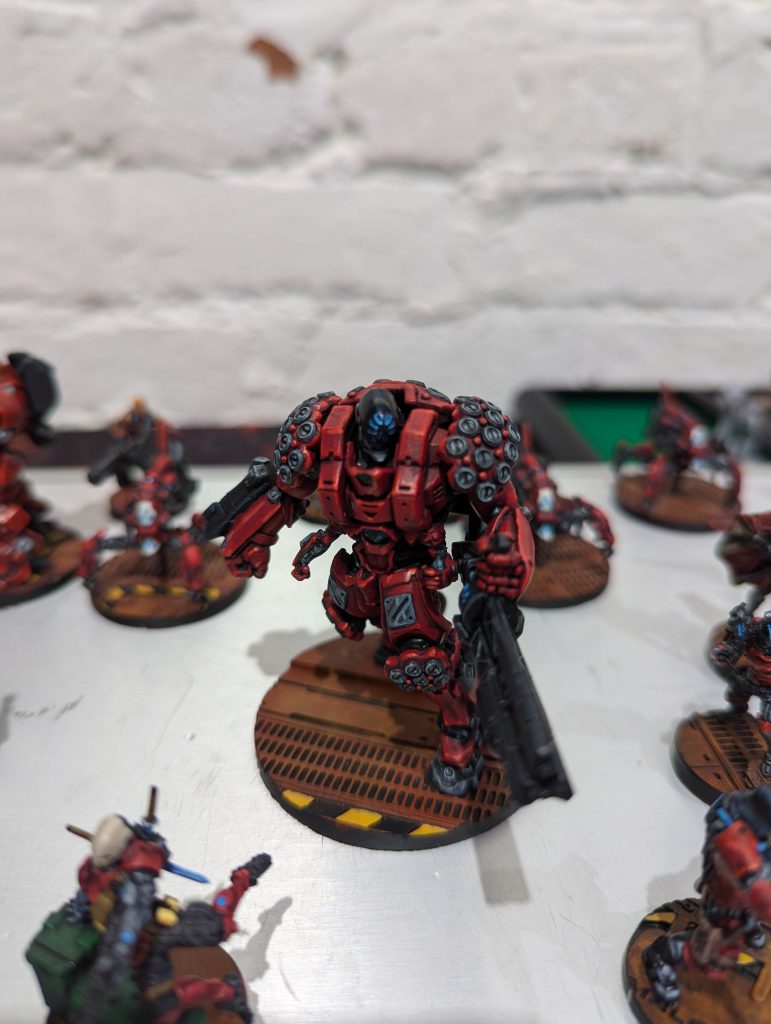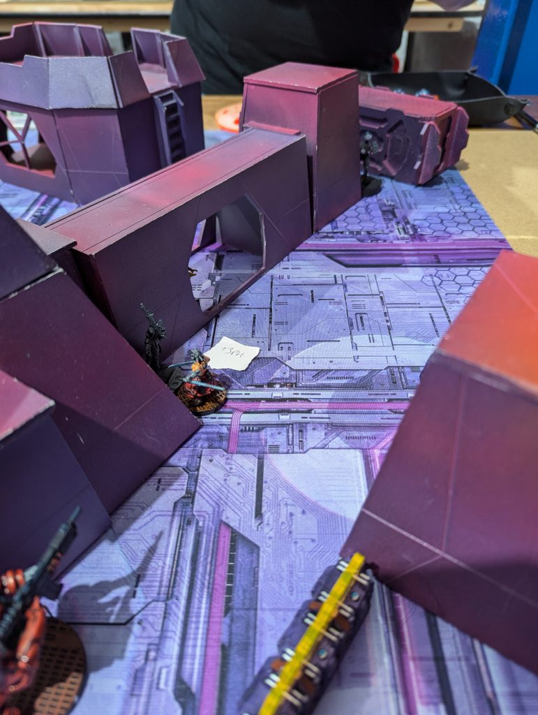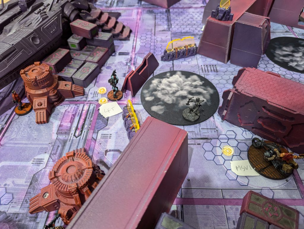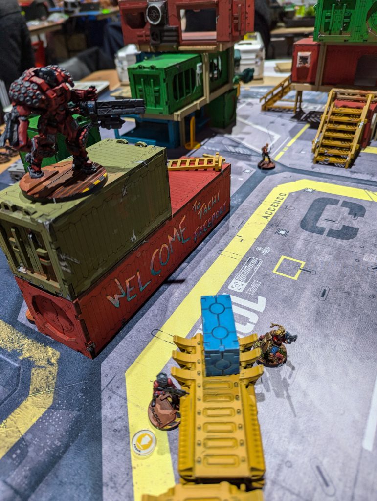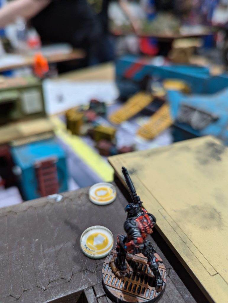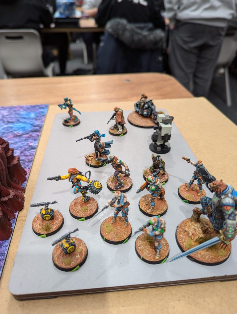 This was an absolute banger. Firefight is always a brawl and I liked the custom twist of HVTs. Having 1OP that needs a Specialist to score is a fun tension when there are 2OP for having more Specialists killed than your opponent. Both of us were having a real laugh throughout, and though my opponent struggled to break through my defence, I think the game was quite close in terms of total casualties. There were some real risks being taken as my Gecko, TR bot and Knauf defended my table half throughout the game. I was again left kicking myself that I had spent so much of my Active maneuvering blasting red fury rounds into armour, but even so I might have had his Lt if not for Fiddler going mental at the top of Round 3. Going into the last game of the day, I had won decent (5TP) victories but was lagging behind the frontrunners in OP score. I had a feeling I would miss those 2OP I’d lost along with my Rounder…