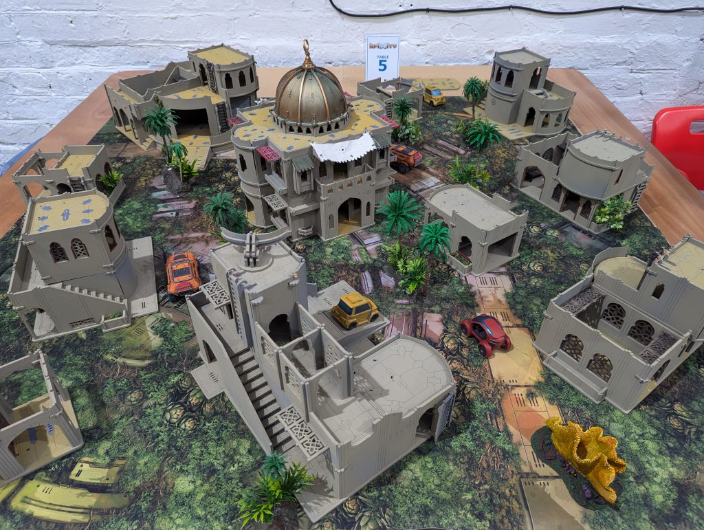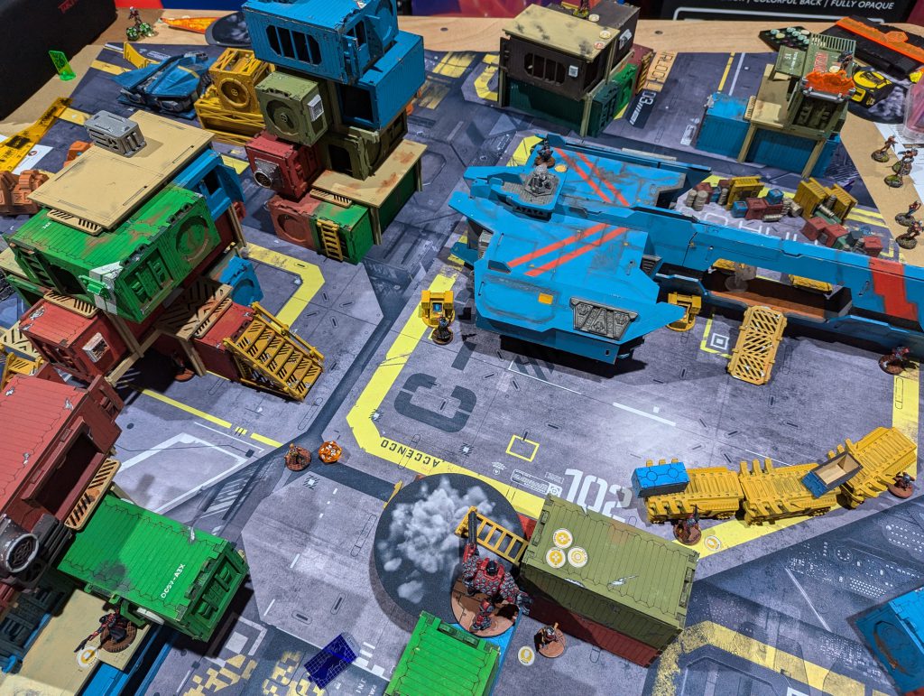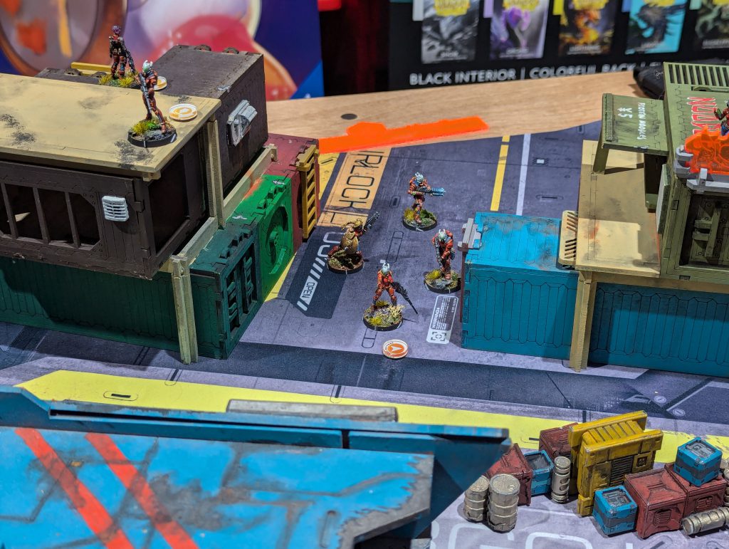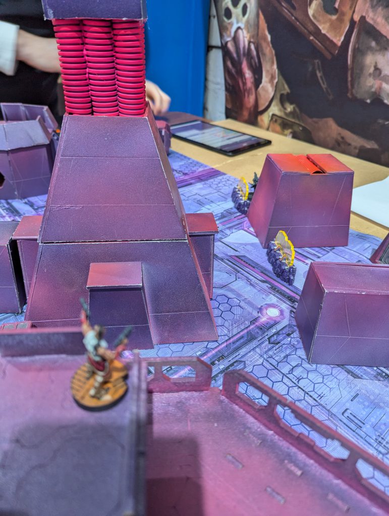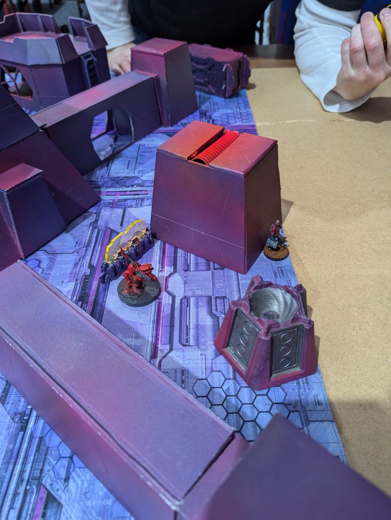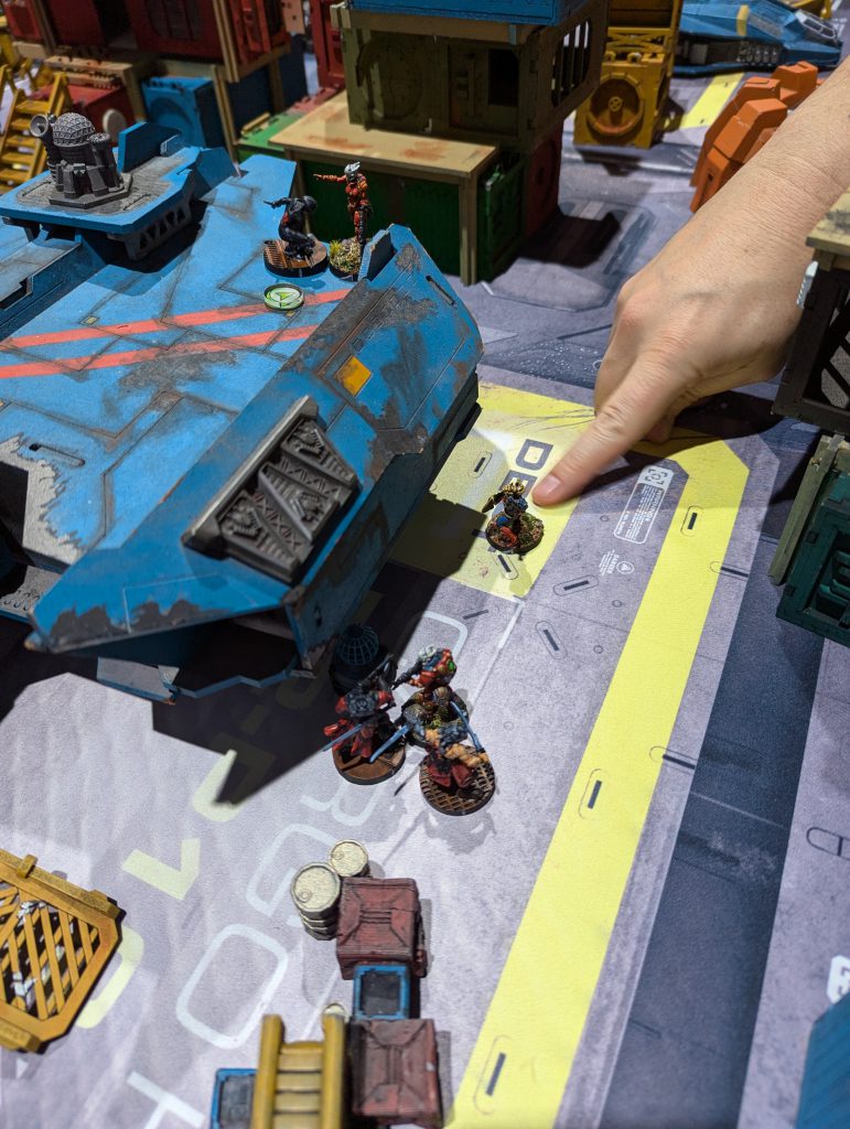 This was an absolute banger. Firefight is always a brawl and I liked the custom twist of HVTs. Having 1OP that needs a Specialist to score is a fun tension when there are 2OP for having more Specialists killed than your opponent. Both of us were having a real laugh throughout, and though my opponent struggled to break through my defence, I think the game was quite close in terms of total casualties. There were some real risks being taken as my Gecko, TR bot and Knauf defended my table half throughout the game. I was again left kicking myself that I had spent so much of my Active maneuvering blasting red fury rounds into armour, but even so I might have had his Lt if not for Fiddler going mental at the top of Round 3. Going into the last game of the day, I had won decent (5TP) victories but was lagging behind the frontrunners in OP score. I had a feeling I would miss those 2OP I’d lost along with my Rounder…