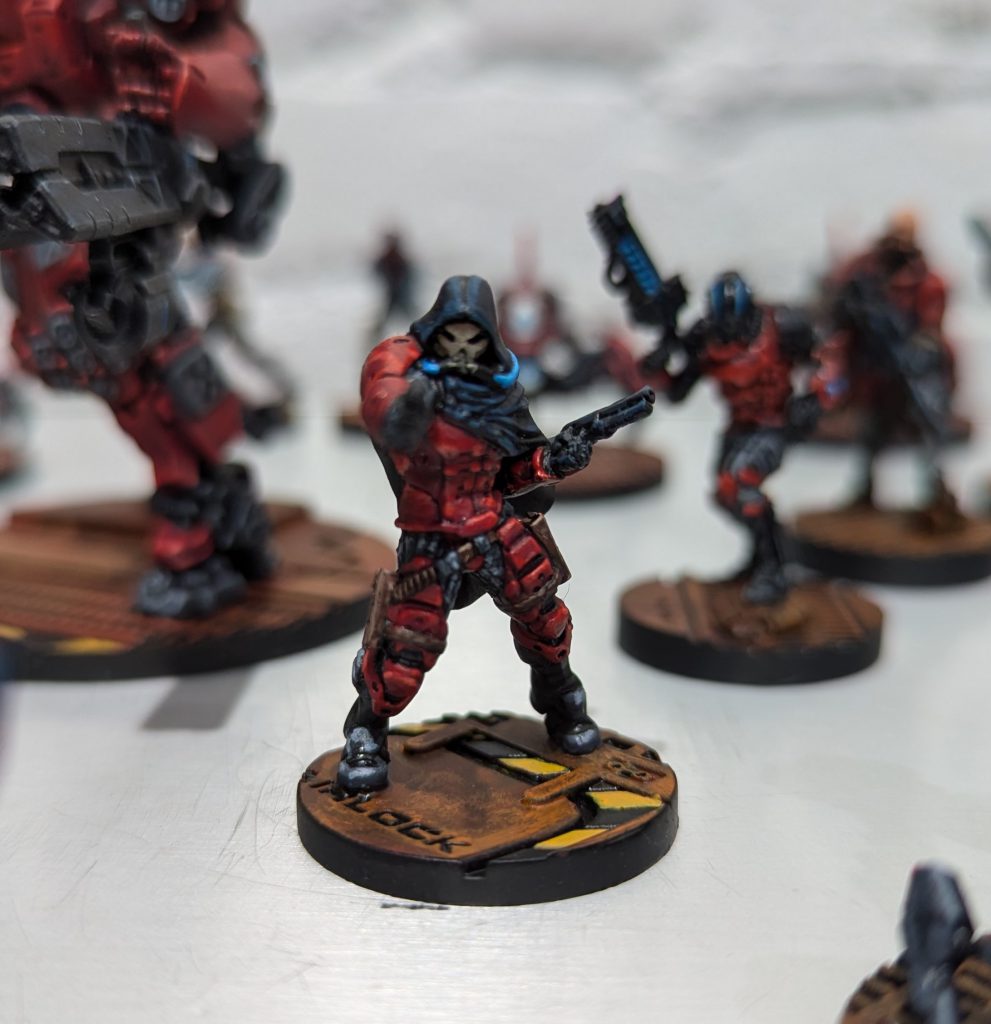 My Unmasking list did include the Corregidor/Nomads stalwarts of Jazz, Billie and two Morans. Even with an exclusion zone, it’s too strong a capability to leave behind. I took a pair of Puppetbots, the AP Marksman and shotgun FO, since they’d be useful in defence, attack and could activate consoles. I also reached for the Uberfallkommando, probably the strongest unit I don’t regularly take, just because I’ve never appreciated them enough and I didn’t fit them into the other list, where they really should have gone given the missions! But there are no missions where you can’t use Eclipse smoke and 3-Peripheral melee shenanigans. I retained the Rounder and one Morlock as simply being useful pieces and squeezed in a Marspider paramedic, because it’s a fun piece that can push forward, assault things and also activate objectives, which can be efficient in Unmasking. Similarly I took a Heckler Killer Hacker. He is reliable at activating the consoles, can start at the edge of the Exclusion Zone in camouflage, and if I have to push him on to attack the Designated Targets, he packs an assault pistol, which is great at reliably putting them down.