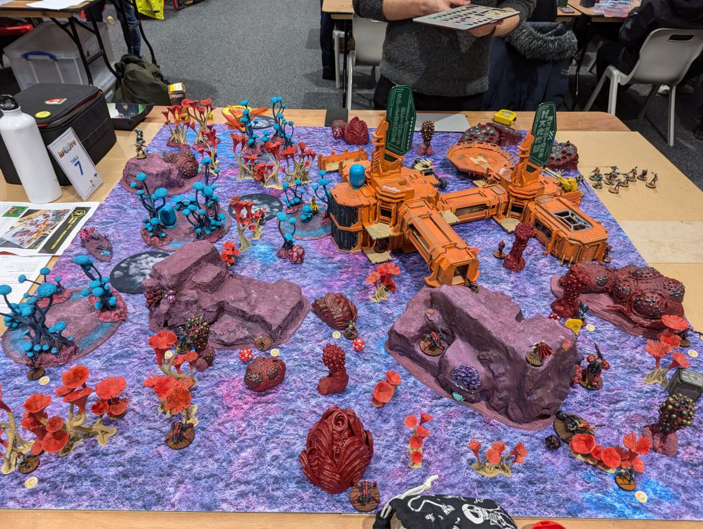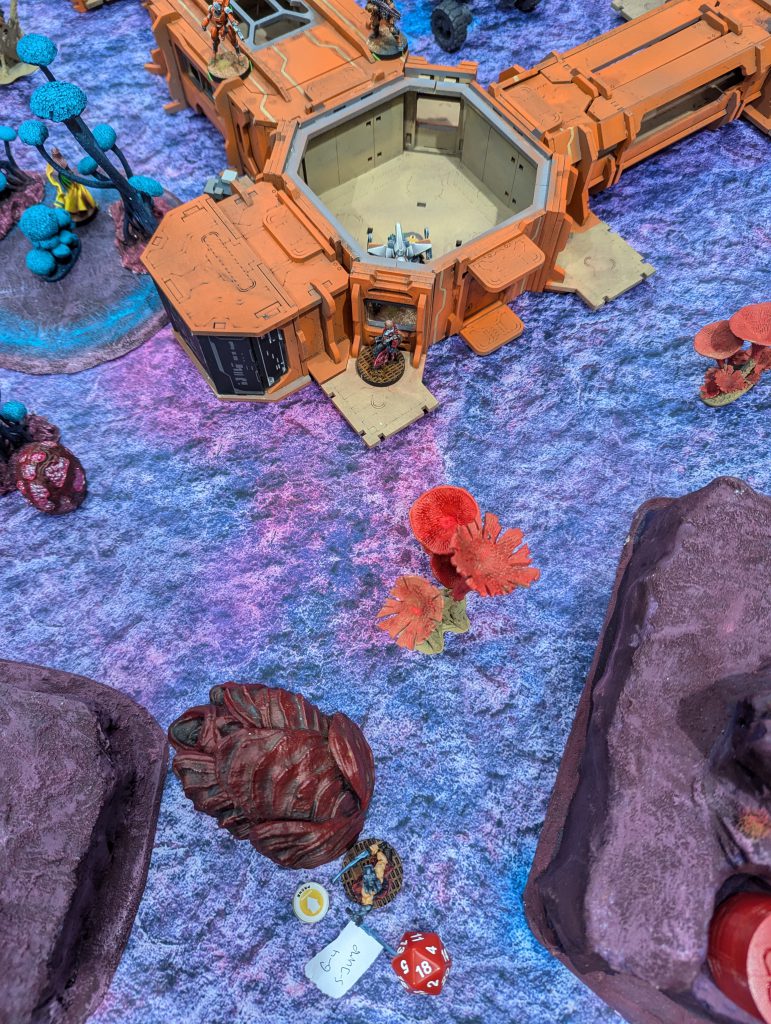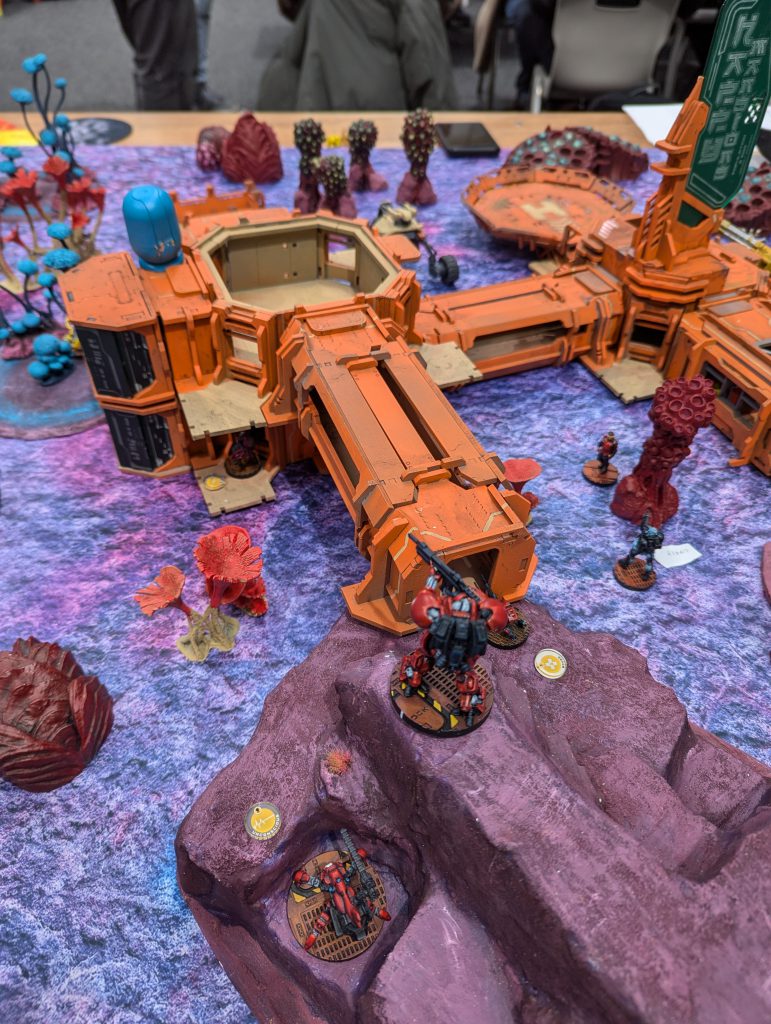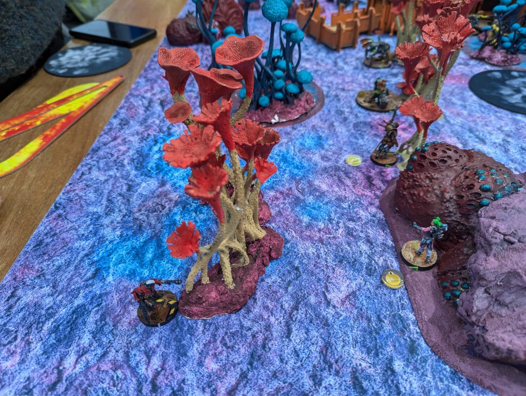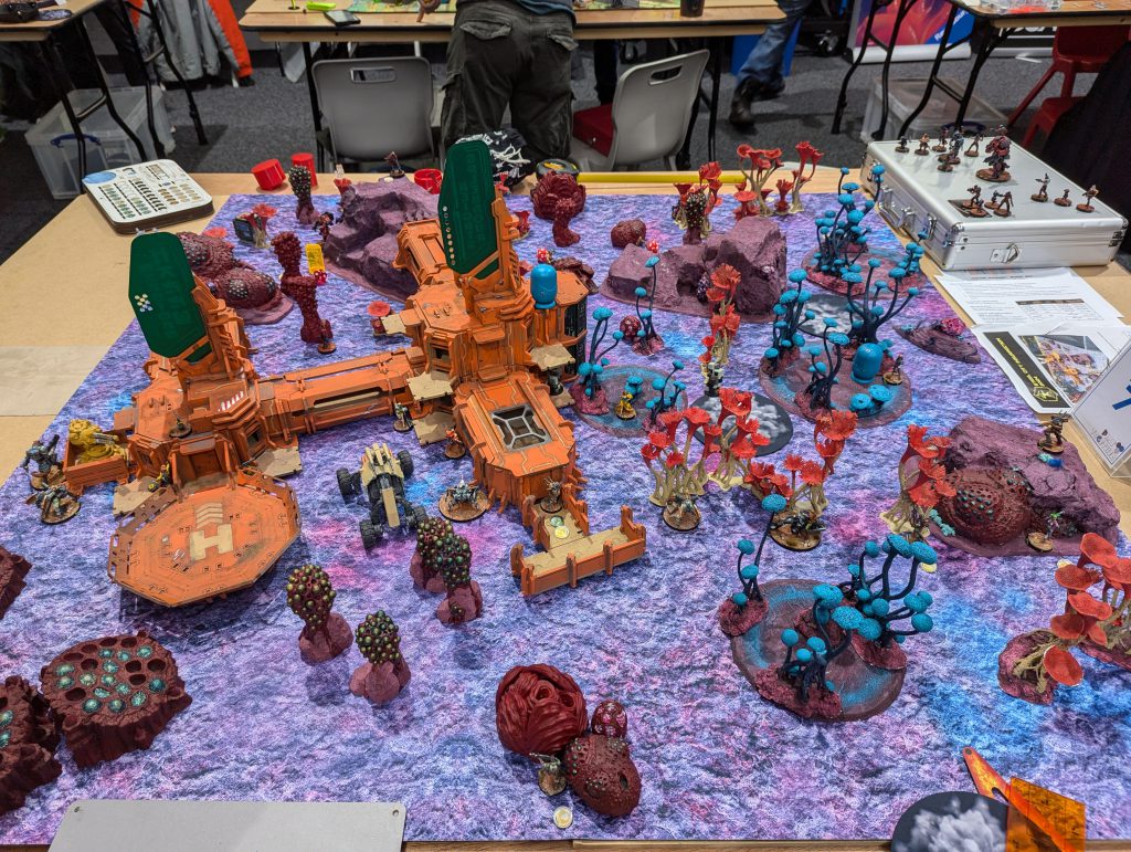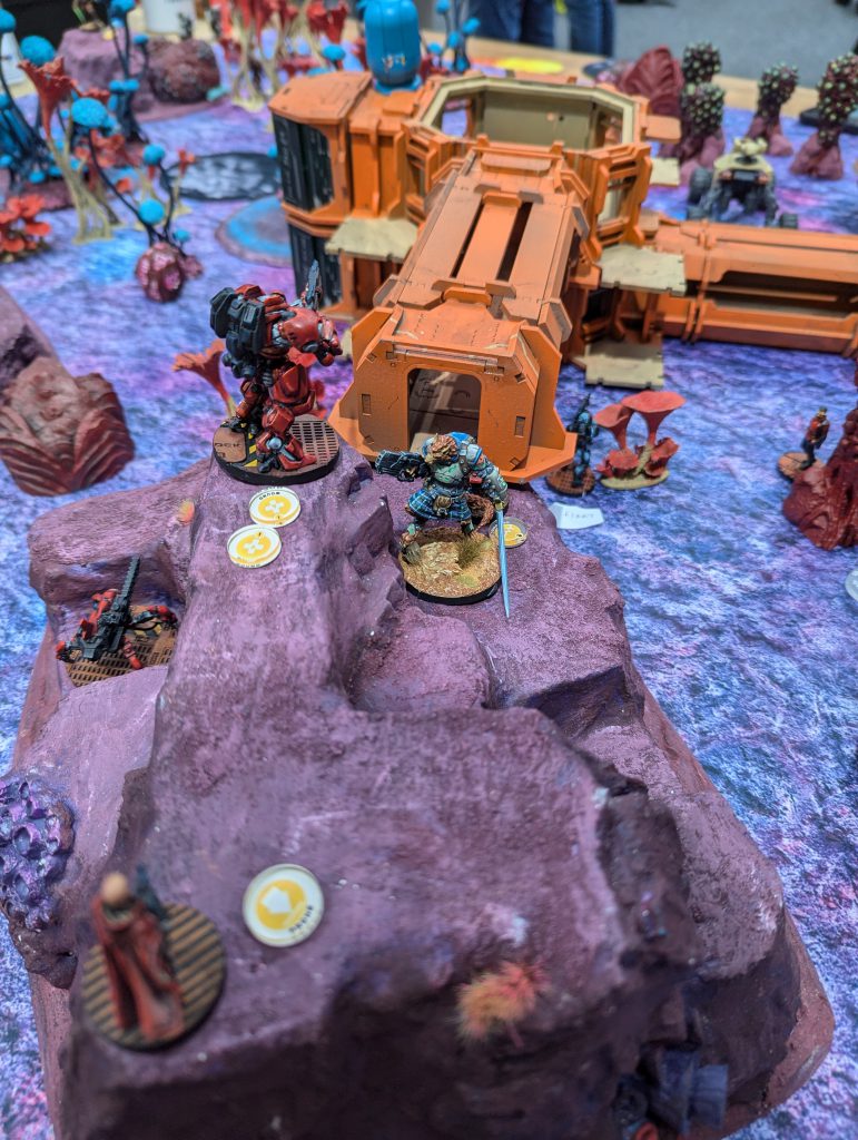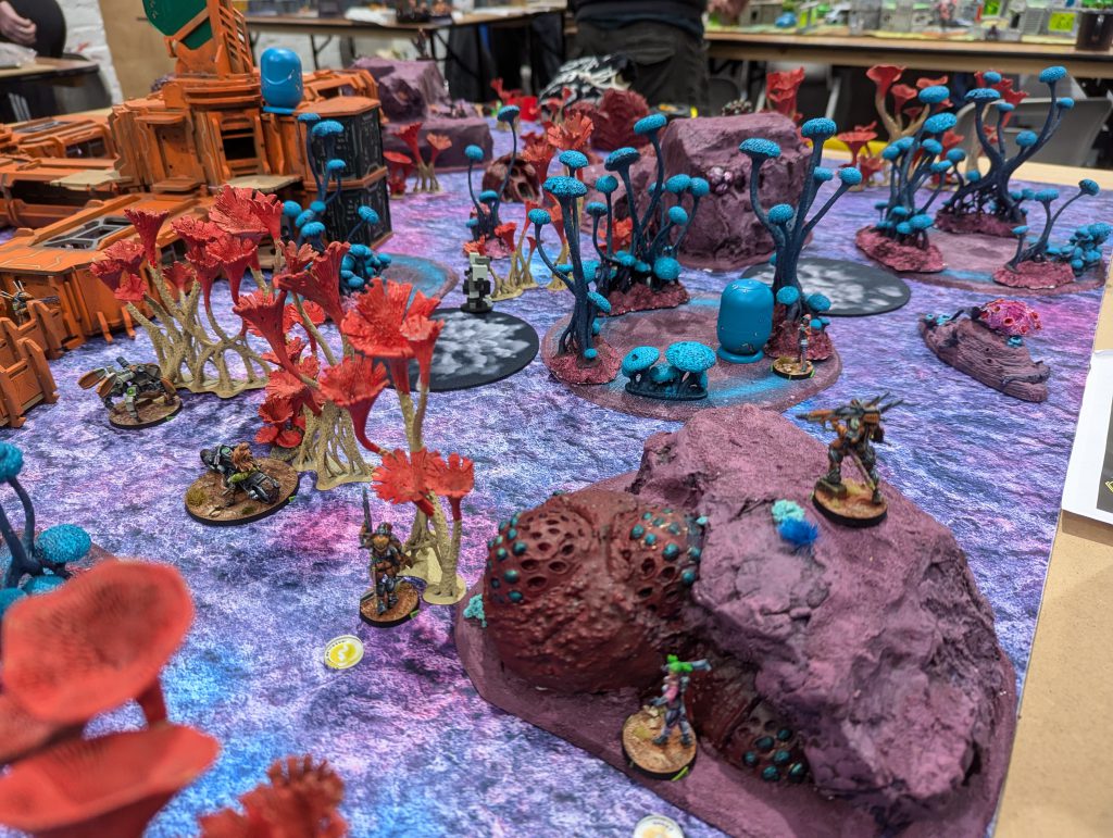 I was lucky enough to draw against the guy who would go on to be voted best painted of the event (richly deserved) with his spectacular Dashat Company. So this was a visually rich game, especially as we played on a vibrant table. It looks very open in these pictures, but the alien fungus-trees on big circular bases were played as blocking all LoF if you were fully on the other side from the target - similar to Obscuring terrain in 40k (I believe), you could shoot into or out of them but not clean through. They were Difficult Terrain (Zero-G) and low visibility and Saturation zones, and even has an extra zany rule: any model which went Prone inside one of these ‘faerie rings’ would gain Targeted at the end of the Order. Zesty! The smaller stands and lines of alien foliage were played as solid walls to further block LoF, and the large building complex was played as ‘into but not through’ for LoF, so actually the table was relatively dense.