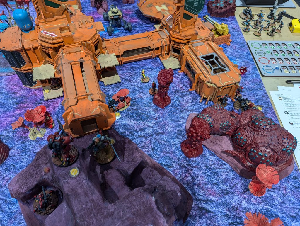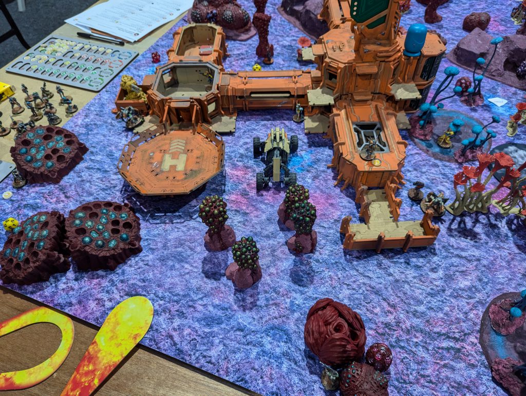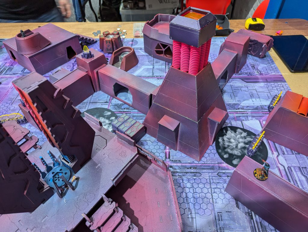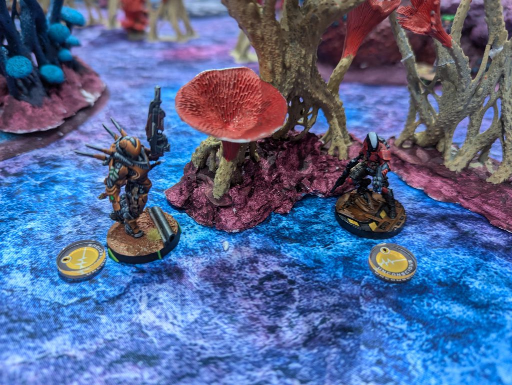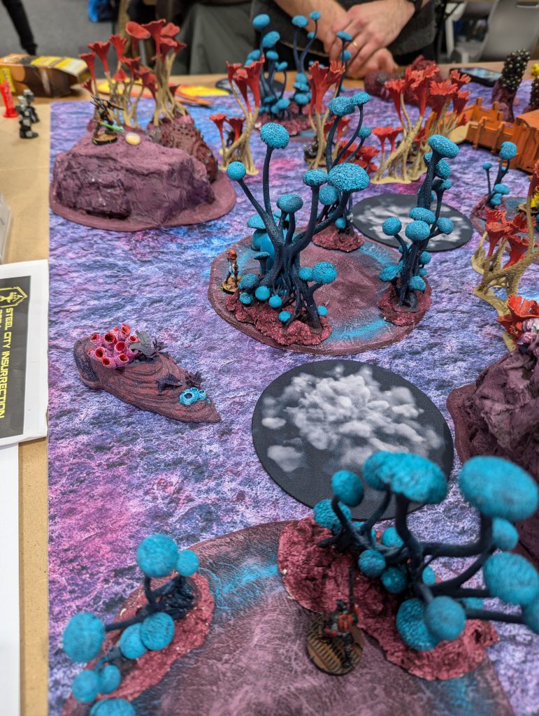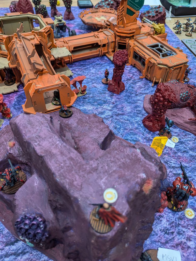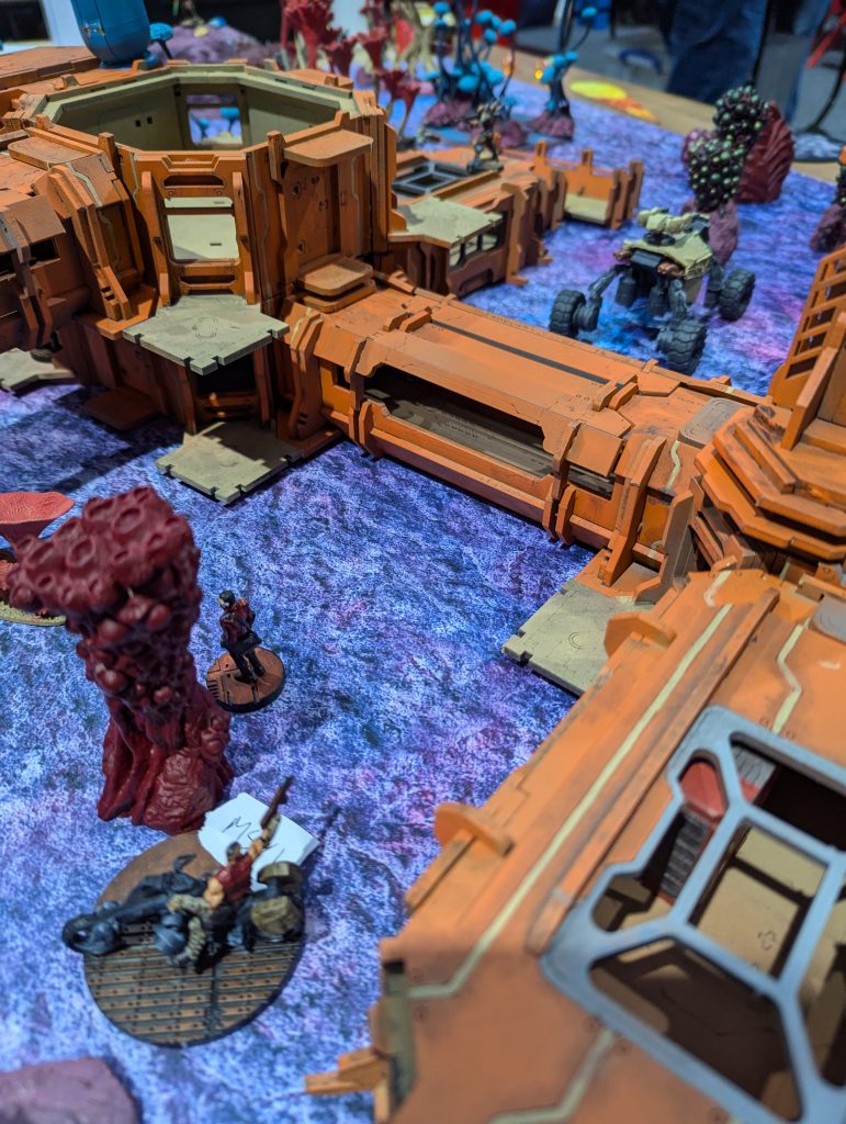 I was lucky enough to draw against the guy who would go on to be voted best painted of the event (richly deserved) with his spectacular Dashat Company. So this was a visually rich game, especially as we played on a vibrant table. It looks very open in these pictures, but the alien fungus-trees on big circular bases were played as blocking all LoF if you were fully on the other side from the target - similar to Obscuring terrain in 40k (I believe), you could shoot into or out of them but not clean through. They were Difficult Terrain (Zero-G) and low visibility and Saturation zones, and even has an extra zany rule: any model which went Prone inside one of these ‘faerie rings’ would gain Targeted at the end of the Order. Zesty! The smaller stands and lines of alien foliage were played as solid walls to further block LoF, and the large building complex was played as ‘into but not through’ for LoF, so actually the table was relatively dense.