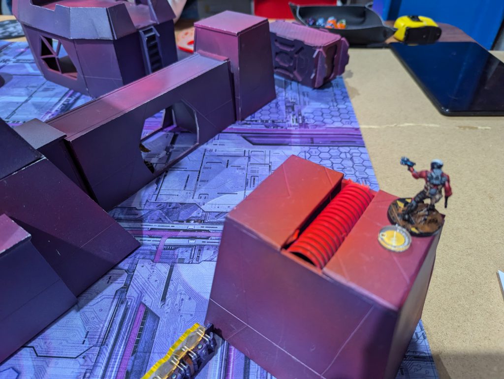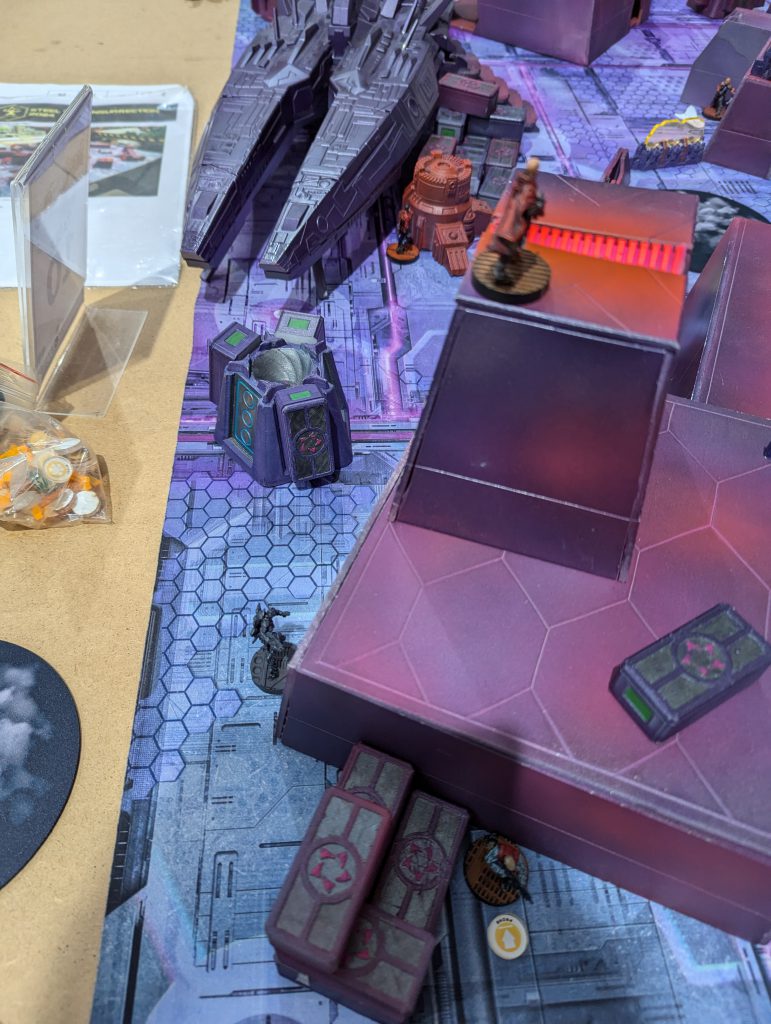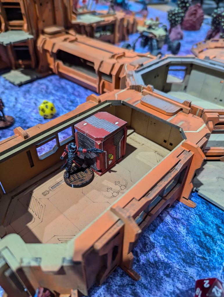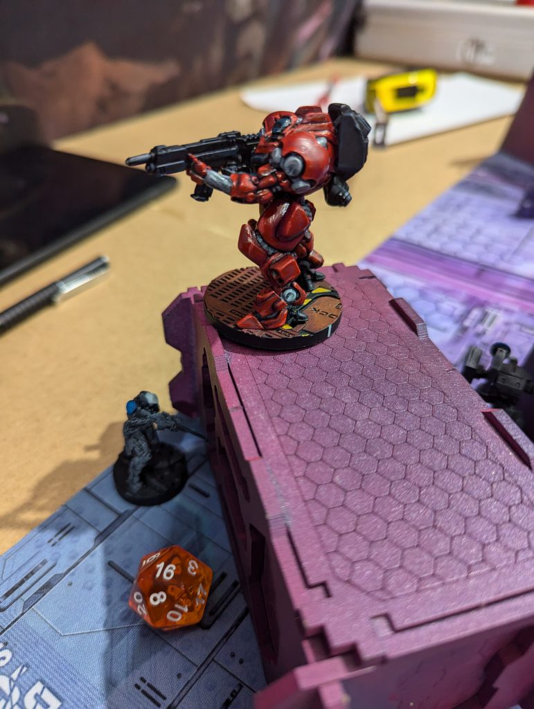 Ben’s Bolt Fireteam of doom repositioned, so that they had one sniper atop the central building of his DZ, one sniper in front of it atop the spaceship roof, and the other Bolts and Valkyrie in the ‘valley’ between. Both snipers could see huge sweeps of my DZ, so that was the problem I had to unlock in my first turn. His last Orders were moving a Zero Killer hacker up to the central console, activating it, and revealing the Decoy on my right.