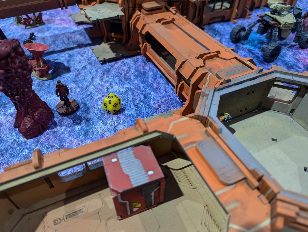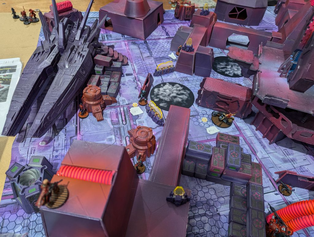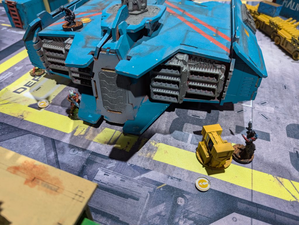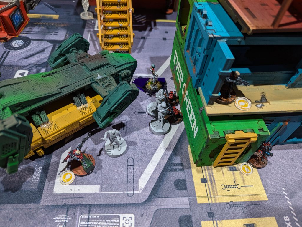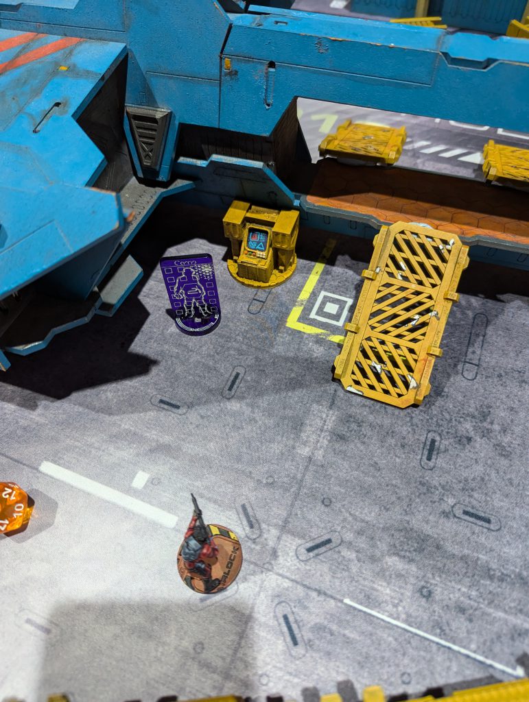 Ben’s Bolt Fireteam of doom repositioned, so that they had one sniper atop the central building of his DZ, one sniper in front of it atop the spaceship roof, and the other Bolts and Valkyrie in the ‘valley’ between. Both snipers could see huge sweeps of my DZ, so that was the problem I had to unlock in my first turn. His last Orders were moving a Zero Killer hacker up to the central console, activating it, and revealing the Decoy on my right.