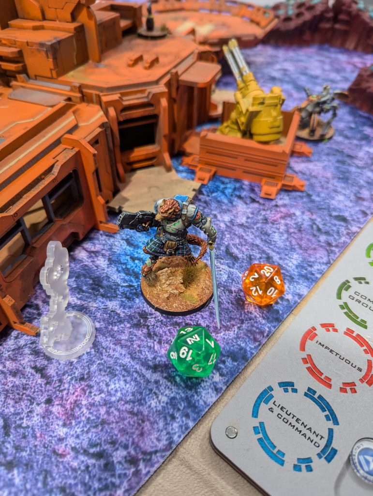 I docked two Orders from McMurrough’s Combat Group, as it was largely Irregular, and I wanted to limit that reach. This gave my opponent more Orders to play with his Fireteams (the bulk of power in the other Group) but I thought they would find it harder to maneuver forward, and if they did at least I would have better targets to counter-attack into. The opening Impetuous move from McMurrough was contested by my Puppetbot, who could just see the top of his Silhouette over the building. McMurrough failed his smoke (on 19) by rolling a 20, while the bot rolled a 1 and hit home, wounding the beast. He Guts Rolled to Prone and parked that for a while. McMurrough would either have to contest multiple AROs to assault anything immediately, or spend too many Orders moving and throwing smoke while Prone.