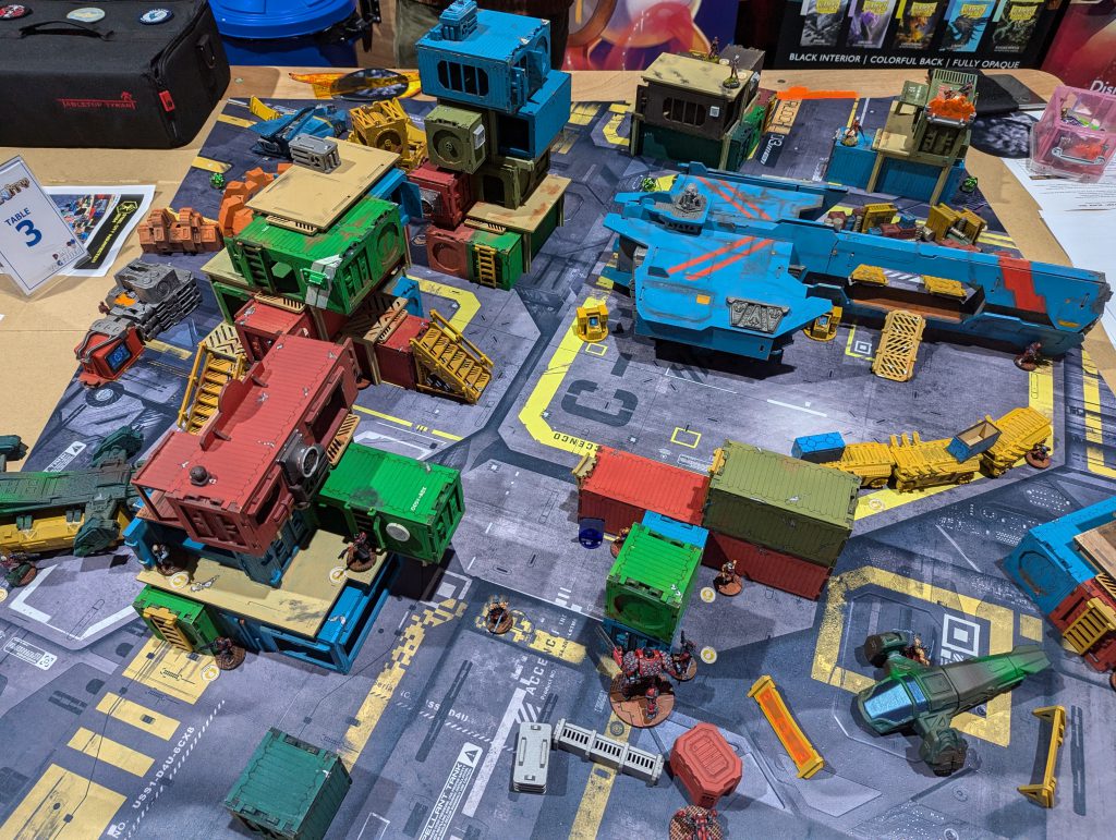 I got to play a third super nice guy, Ben, who I have played once before. This time he was using Foreign Company, and they were another gorgeous set of models (he would come 3rd in the painting competition). It was also a neat table with some container-building towers and a spaceship unloading area. As soon as he knew I was using vanilla Nomads we started joking about a two-Uberfallkommando game, and that would come to pass. I won the roll-off, and actually picked deployment. I was sure Ben would use a Bolt fireteam, which means a castle with an MSV1 Marksman sniper. I wanted to counter-deploy, and also wanted to force him into the side with slightly more restrictive vantage points. Beyond the Uberfallkommando, I was relatively sure that with an Exclusion zone I could stave off any first turn alpha strike from ForCo, and playing second can be helpful in Unmasking to flip consoles back from the opponent, so I was fine with that.