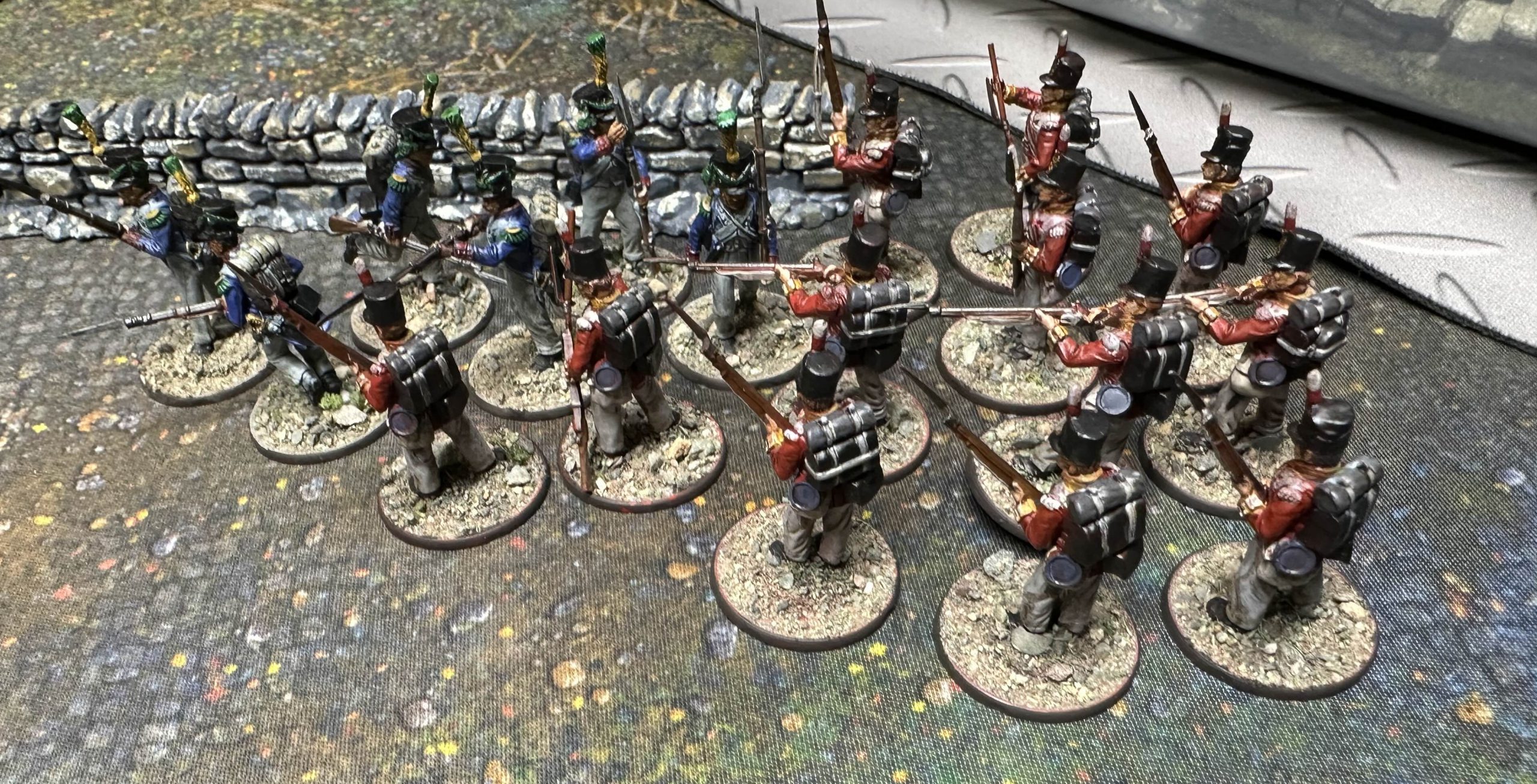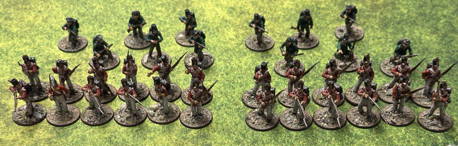 A fairly elite Peninsular War force for Rebels and Patriots, with two units of Veteran Sharpshooter Skirmishers, and two units of Line Infantry. Credit: Eric Lofgren, painting by Calvin at Nevermore Studios