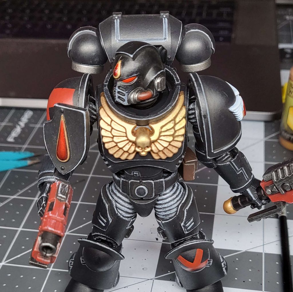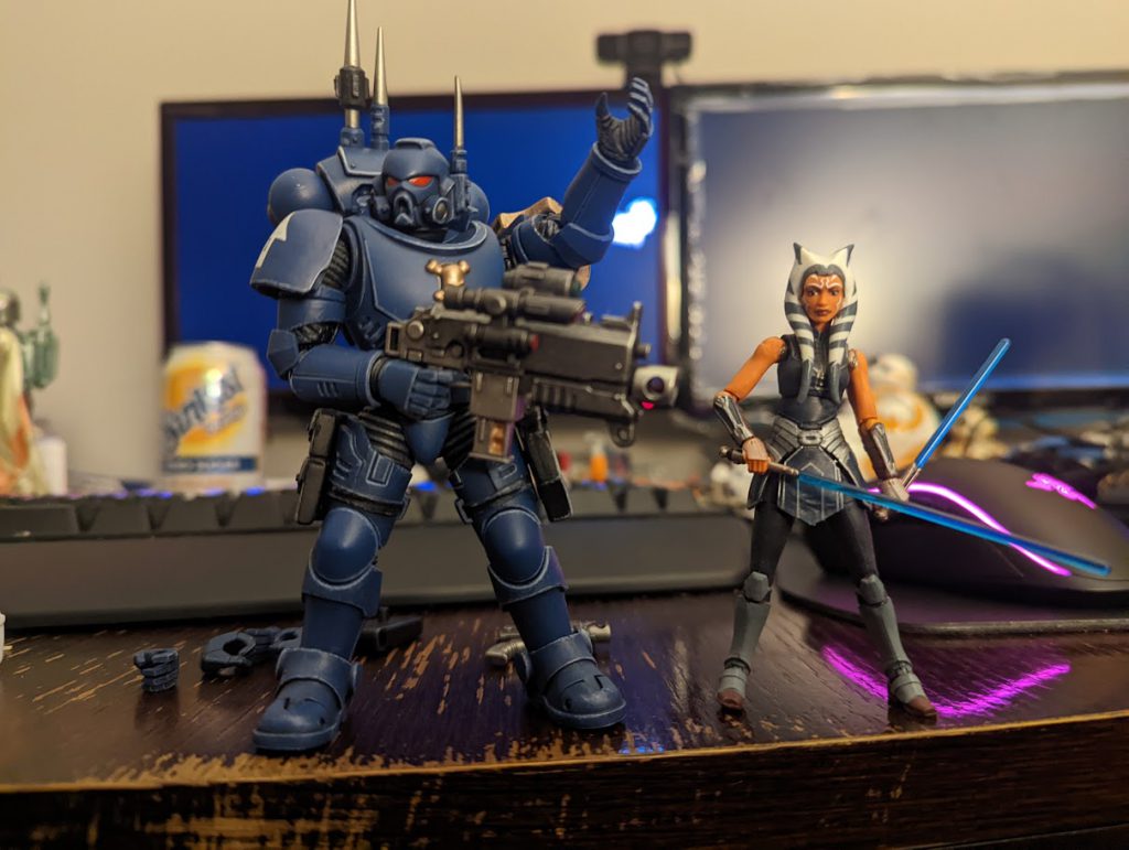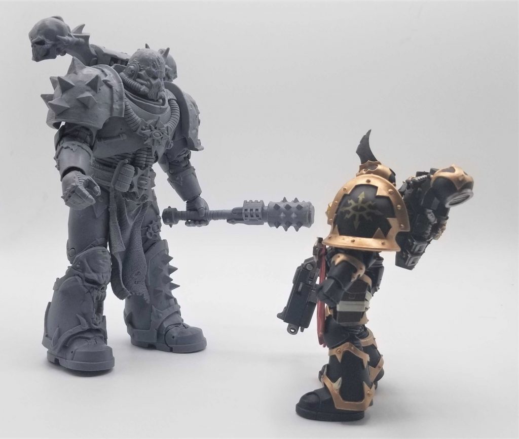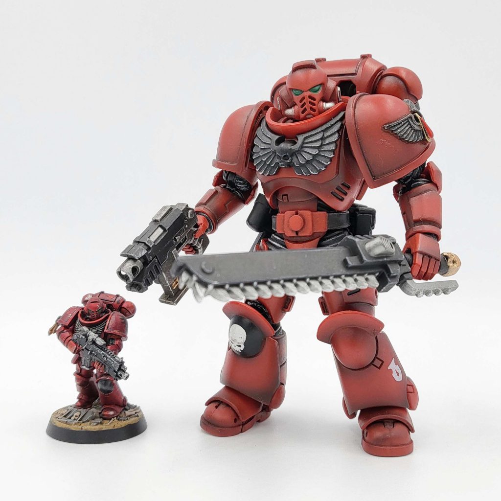 These figures are in 1/18 scale, which is *technically* the same scale as Star Wars Vintage collection. However, as you can see here, a Primaris Space Marine is going to dwarf a teenage Republic General/Imperial Fugitive. These figures are incredibly faithful to the GW boxart, with iconography done "by the book". The paintjobs in particular are absolutely spectacular, and JoyToy has apparently stated that they use actual GW paints. Given what my fellow Kevin below had to do with his, I can absolutely believe that.
