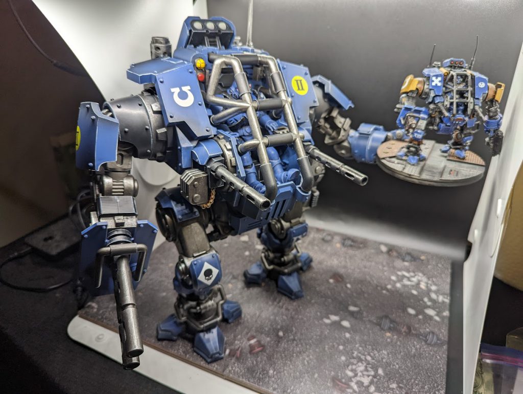 The Venerable Dreadnought is likewise an amazing figure, even if it is a fair bit smaller than the Invictor. The legs of this monster are likewise fully articulated, so you can put the monster in a forward-facing crouch, or pose it standing triumphantly on an appropriately-scaled hero rock. It does not, however, have any weapon options: you get a twin Lascannon and a Gravis Fist with Storm Bolter. The arm with the Gravis Fist is articulated, but the fist itself is not. This means, in pertinent part, the Venerable Dreadnought cannot hold a 40K scale VenDread, nor can it give people the finger.