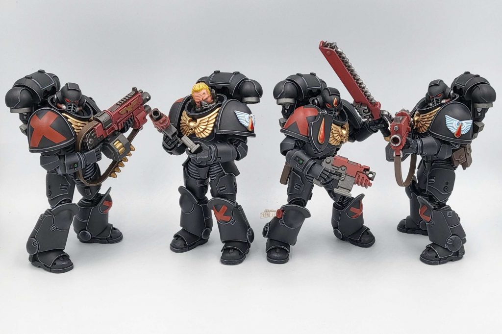 The figures themselves are extremely poseable, with stable joints in order to hold all manner of positions. Naturally, it is easier for an Infiltrator to make different positions than a bulkier Black Legion Marine. These guys easily outclass the MacFarlane figures on poseability. In terms of accessories, your average Marine figure will come with wargear that the model can take on the tabletop. The Infiltrators come with a selection of hands, their special bolters, and a removable power pack. The Bladeguard come with Heavy Bolt Pistols, Storm Shield, and Master-Crafted Power Sword. You won't be getting a ton with any one action figure (except for a specific Bladeguard that comes with pretty much every option possible), but what you do get is appropriate and good.