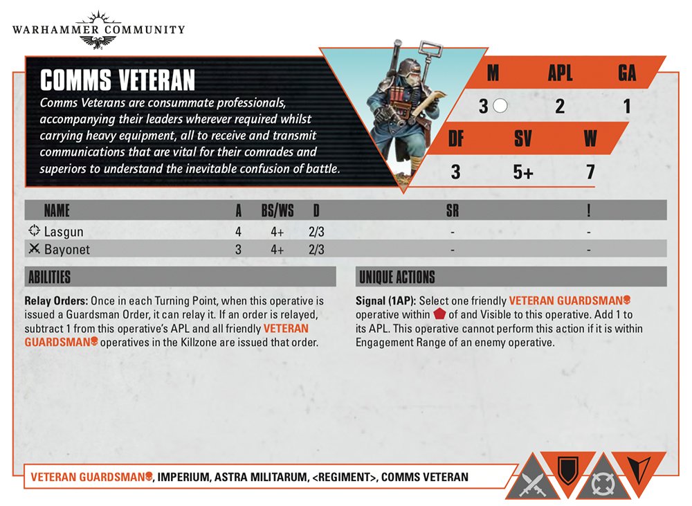 That limitation isn’t as bad as it sounds, though, thanks to the Comms Veteran. This model can relay any order it receives to the rest of your Kill Team at the cost of 1APL. As a bonus, it can spend its other action to increase another model’s APL by 1 for the round if it doesn’t have anything better to do. And while the Sarge is the only model that comes stock with the Guardsman Orders rule, all is not lost if you lose that piece: The Confidant Veteran is your Sergeant’s Second in Command, and can take over as the Leader and issue orders if their Sarge is killed. In the meantime, if the Confidant isn’t the Leader, it can choose a friendly model to activate after it does, letting you line up key actions in sequence with your team.