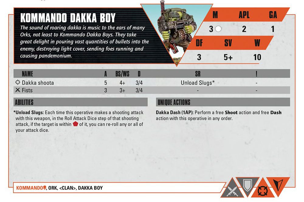 Their Strategic and Tactical Ploys back up this aggressive playstyle. Sssshhhh! And Skulk About give you bonuses to operatives with the Conceal order. The former lets each Kommando that’s either out of sight of any enemies or in the Conceal order make a free dash, while Skulking About lets your Concealed Kommandos get a free normal save as though they were in cover, even if they get caught out. Once you’re ready to get started, Waaagh! will let you upgrade a normal hit to a critical any time you retain more than one normal hit, and Krump ‘Em! gives you a free Fight action at the end of the Firefight phase. Of course, fighting in melee is risky, and Kommandos have an incredible Tactical Ploy to keep them around longer: Just A Scratch costs 1CP and lets any of your operatives ignore damage from a single attack dice.