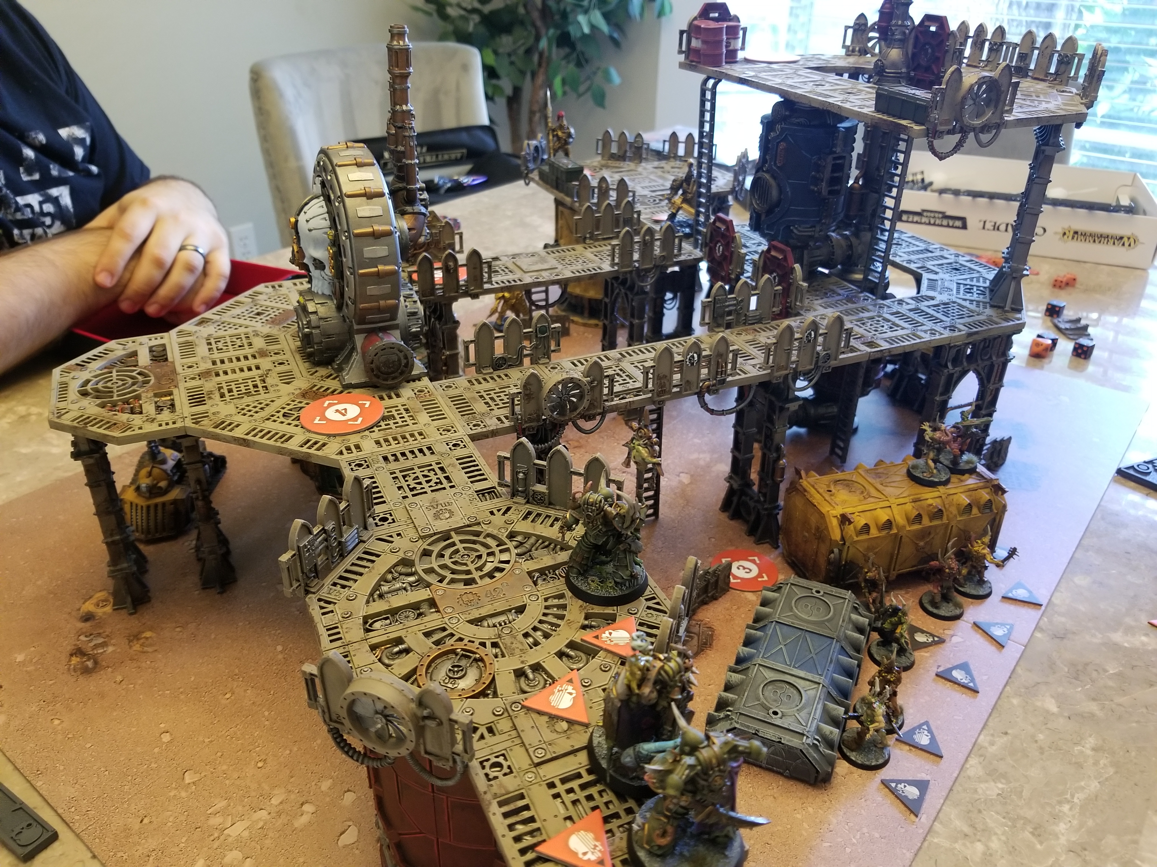 Much hay has been made about the new game’s measurement system, which uses symbols - ▲, ●, ■, and ⬟ - for distances corresponding to 1, 2, 3, and 6 inches, respectively. The boxed set comes with measuring tools for each of these distances and on the whole, this system works fine - provided you actually have the tools on hand, that is. If you don’t have these or a custom measuring tool on-hand (feel free to just draw the symbols on your standard 40k tool), then doing the mental conversions each time is a pretty big pain in the ass. With the tools provided on a physical table, though? It’s fine, and things work out smoothly; the game does actually use the idea of movement being in discrete increments to do some interesting things, such as leaping over gaps between buildings or dropping down from a height; more prosaically all movements in KT are made in straight lines, so if you want to move around something it helps to have more or longer increments available to do that.
