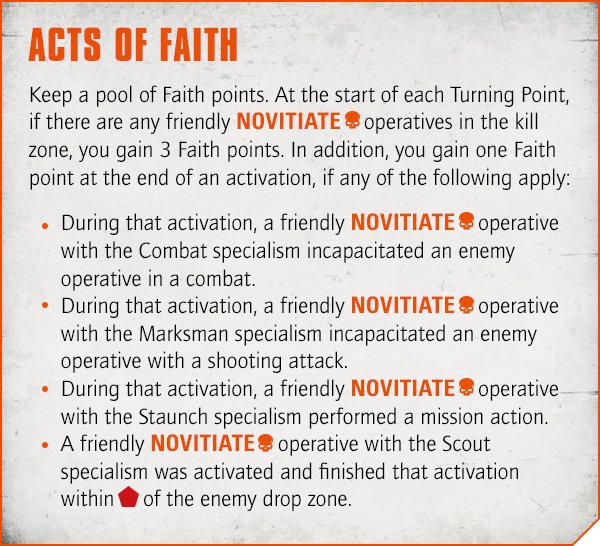 As we mentioned before, Acts of Faith work off Faith Points, which make them a lot like a second, more restrictive CP pool. You get your own list of effects, and you'll get three points at the start of each turn with different ways to spend them. Only one Act of Faith can only be used per activation on an operative, though Faithful Blessing does not obey this rule and can be used alongside another Act of Faith.