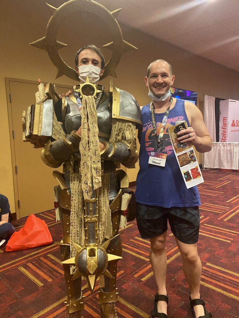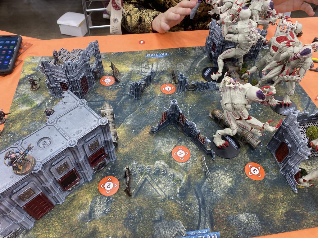 OK, here is the game that set social media on fire. Chris had returned on day two with another gimmick team, this time playing 10 McFarlane Genestealers as his operatives. The T.O. had told him he was fine with it as long as his opponents agreed. To his credit, Chris had glued 25mm bases to one of the feet of each massive Genestealer to represent its position in the game. He had even took the time to wear a suit and cape covered in purity seals that he had been giving away all weekend. He was so committed to the gimmick he was even sweating his ass off in this getup. How could I deny this man?