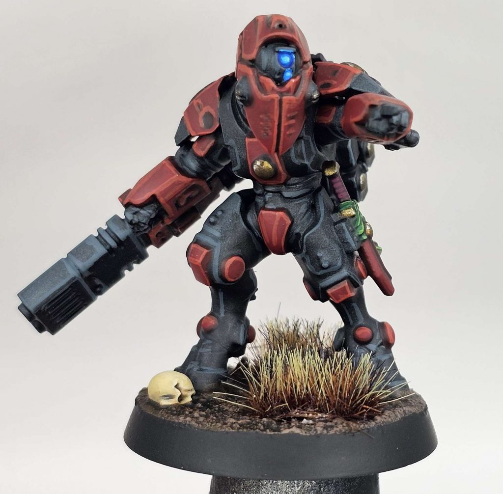 I’ve tried a digicam pattern on some vehicles before and this felt like a good opportunity to experiment with it on figures. To do this I sprayed my Stealths with grey seer and then painted on patterns with black legion and a grey I mixed up, by adding lighter colours to Basilicanum Grey, which I found too dark. I gave the whole thing a wash in Agrax, painted the metals, a few red bits and some lenses, and highlighted the light grey bits in Ulthuaan Grey. They’re based with a rubble mix that got hit with Basilicanum Grey and then drybrushed lighter and I slapped some pigment on the lower legs to make them look dusty. I think it’s created quite a decent effect, looking like they’ve been in the field for a while. I haven’t finished the whole team yet though as it’s not a quick scheme to do.