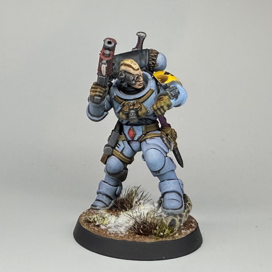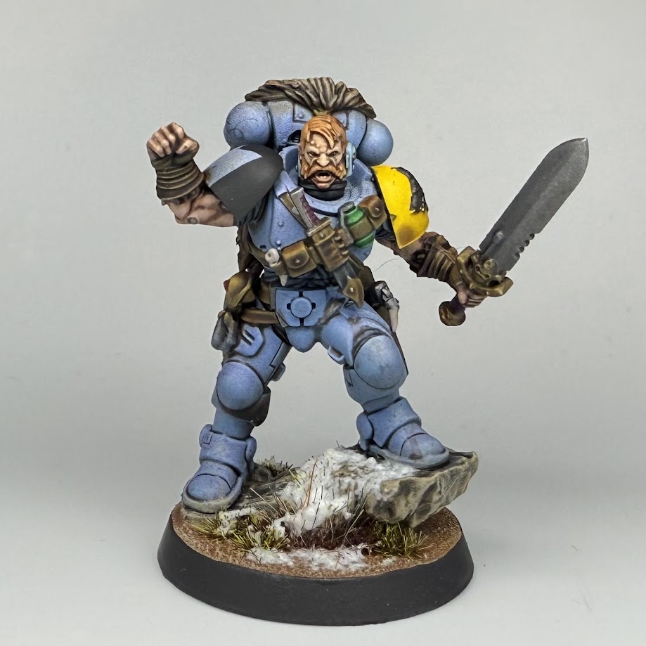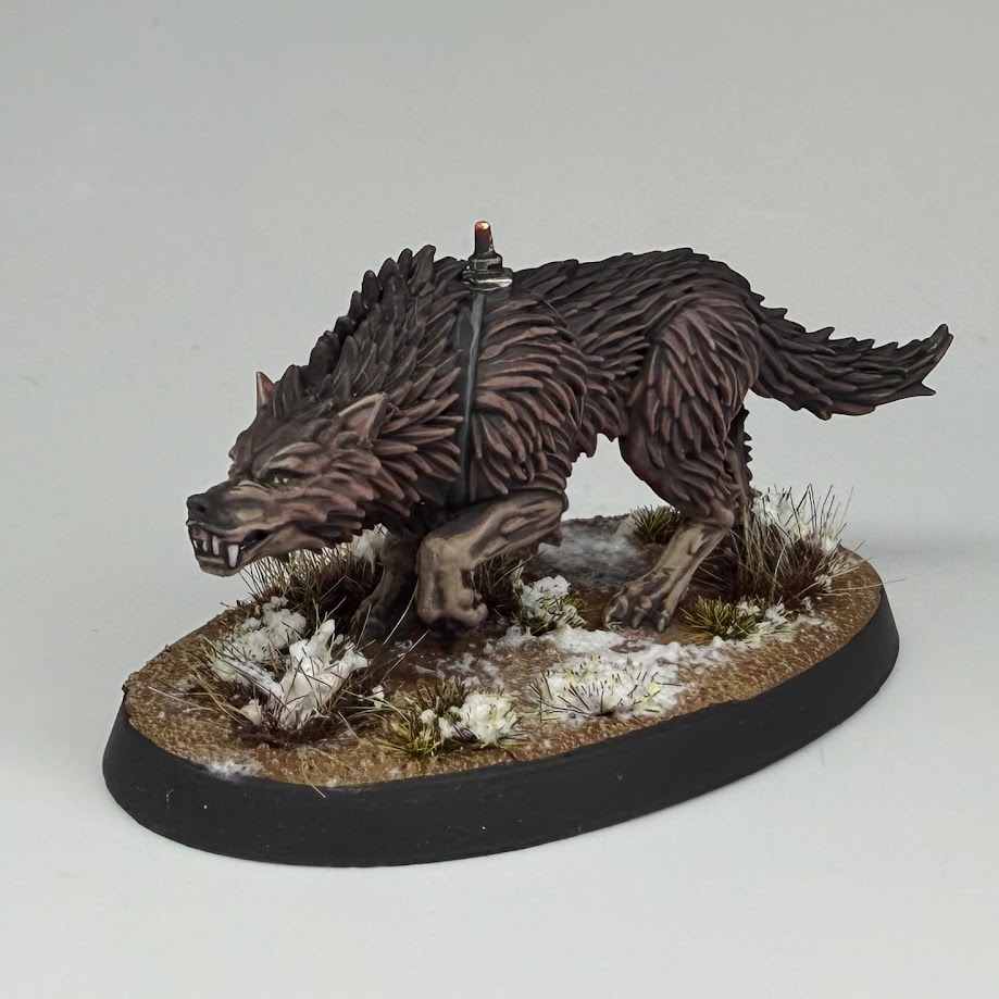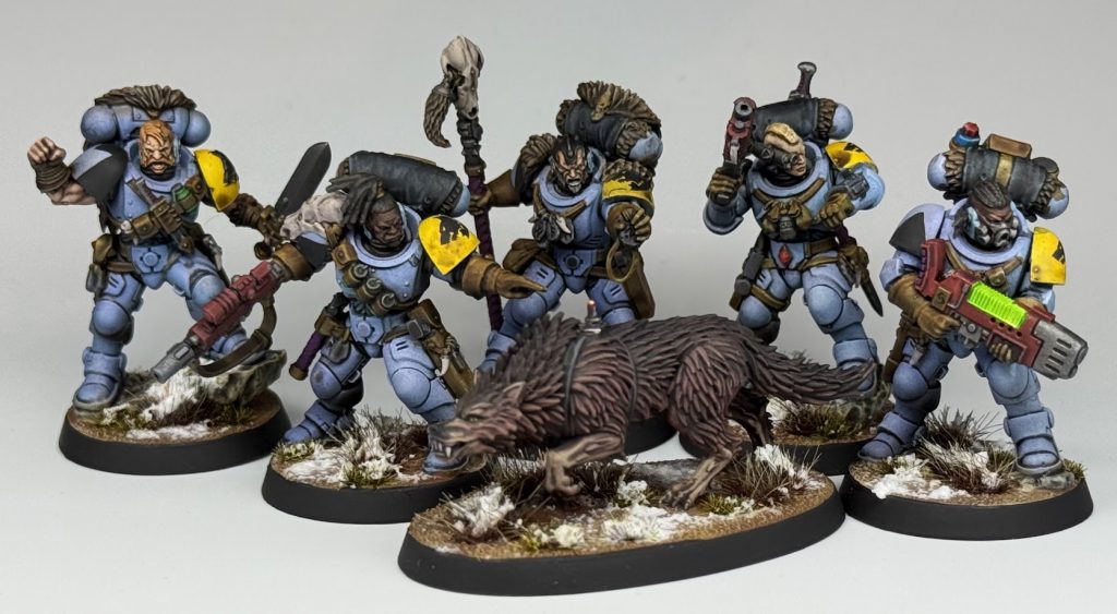The Fenrisian Wolf is based black, before drybrushing up through Mini Colour Chocolate, Jasper and Capuccino, with mixes in between.I’m really happy with how the wolf came out, I think he’s the most finished model of them all. Normal dirt bases with Valhallan Blizzard snow tie the models in with the rest of the Space Wolves I’ve gotten done.