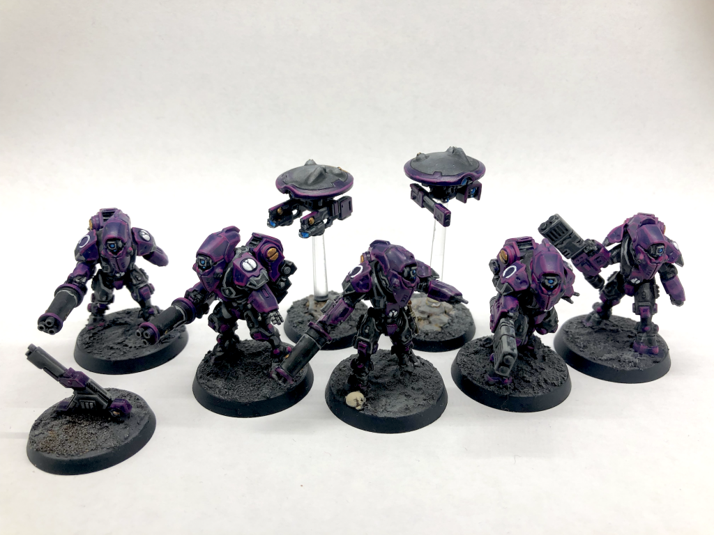 Mine ended up purple because my normal Tau are white and yellow. Owing to their stealthy nature, I wanted to do black and yellow, then realized that that would be Steelers colors, which offended my mid-Atlantic sensibilities. Hence, purple. [Hear, hear. --Ed.]