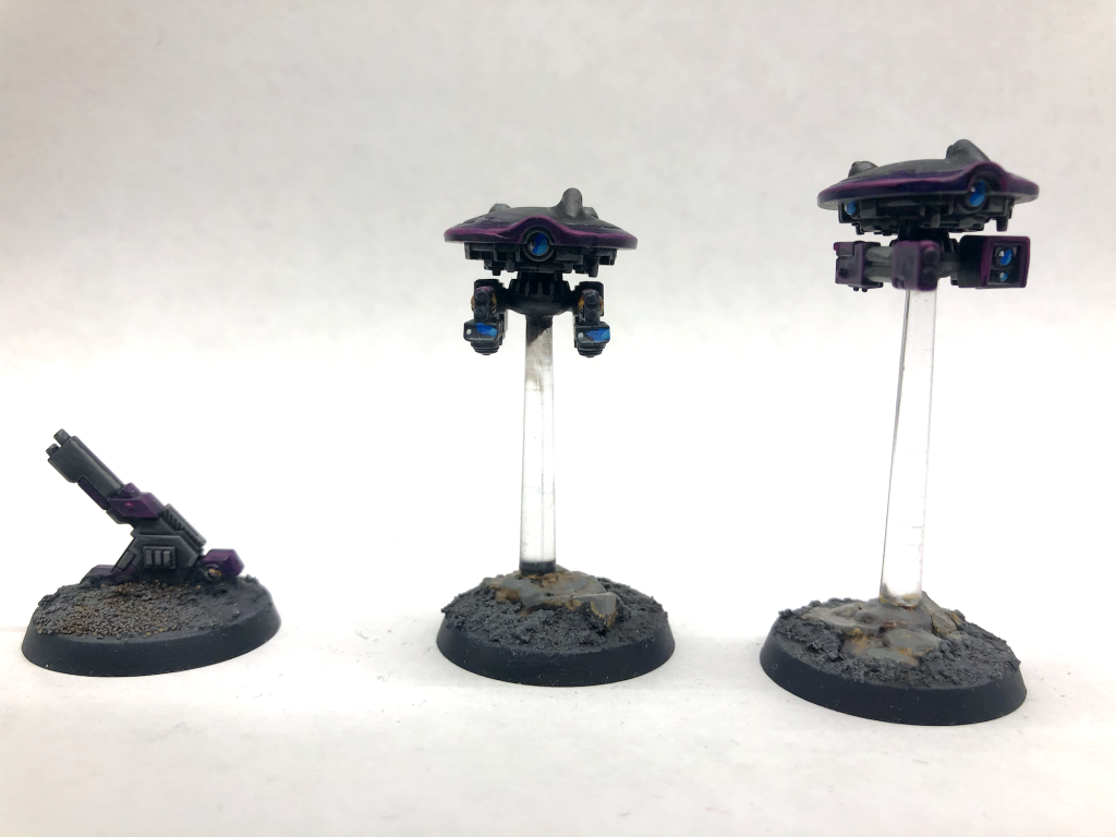 The drones are on 28mm bases. The sprue has a couple of little patches of rocks that you can stick onto these, so that they can take the flying stand. They’re the ball and socket type of flying stand so they shouldn’t snap, though the drones can fall off them, which they’re certain to do at some moment where it seriously matters in a game. That’s fixable with Blu tac or similar.