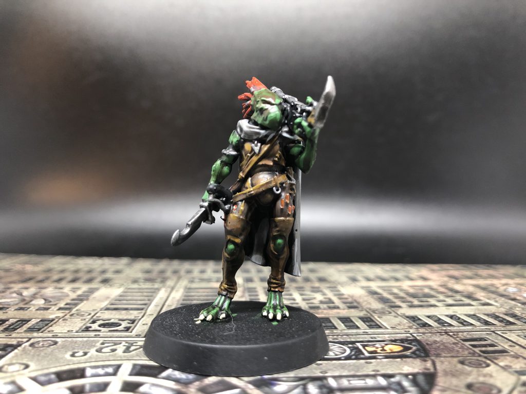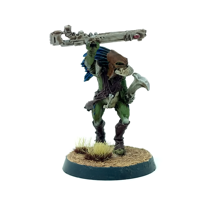 A veteran type operative, this model is a Kroot Warrior with +1 wound and the Hardy rule, which lets it downgrade hits resolved against it from critical damage to normal damage. The Well-Stocked rule gives it two Poison and two Piercing shots for free.