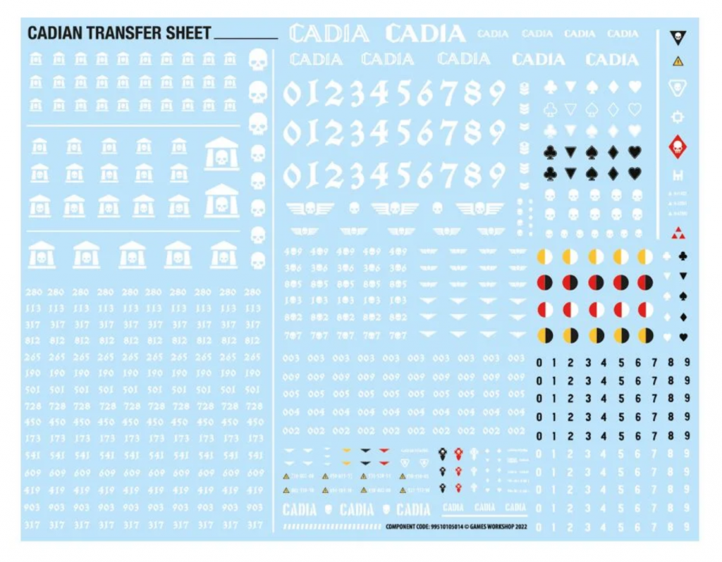 As a side note, also in the box is a new Cadian transfer sheet, distinct from the standard Astra Militarum/Imperial Guard one that has been around for a while, and which should serve you well for sprucing up your Guard units.