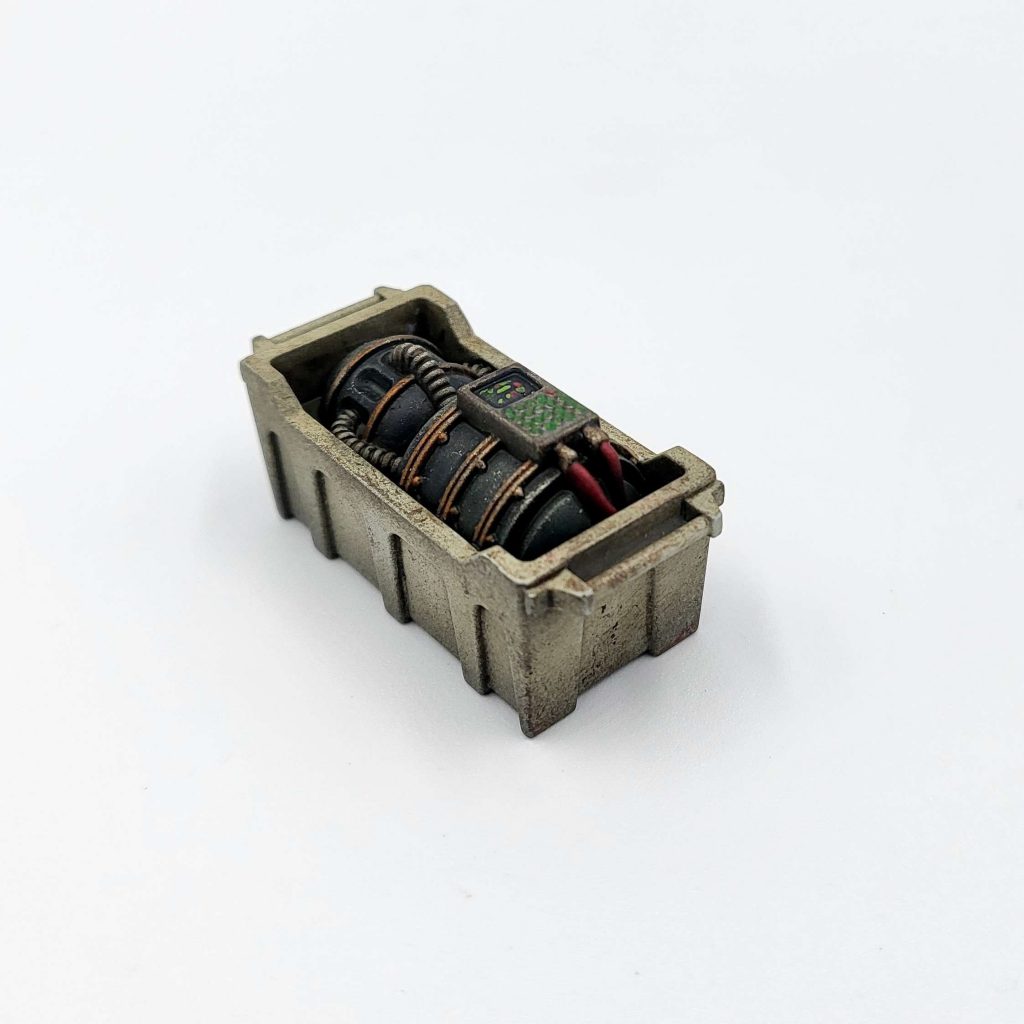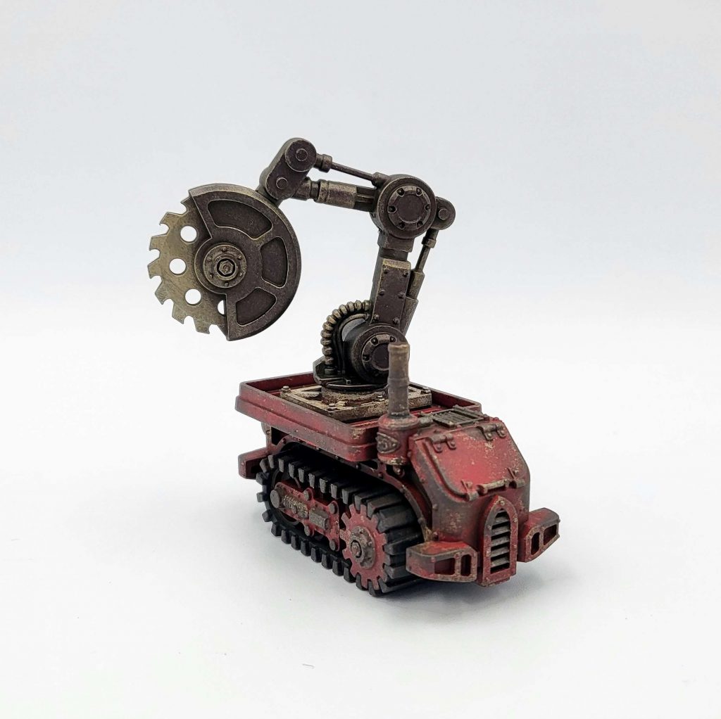 Both paint schemes are very simple. For the bolter trailer, I applied a basecoat of Army Painter Hazardous Smog and hit it with a zenithal of AP Toxic Mist. You don't need an airbrush at all here and anything in the robin's egg blue to light seafoam range will be excellent. The Red trailer is Golden High Flow acrylic Quinacridone Red hit with satin varnish. The bomb container is just a zenithal prime. The saw arm is AP Rough Iron (GW Warplock Bronze) with a drybrush of Canoptek Alloy. I used Black Templar contrast for black details, and gunked up the treads with Dryad Bark to make them a bit more "lived in".