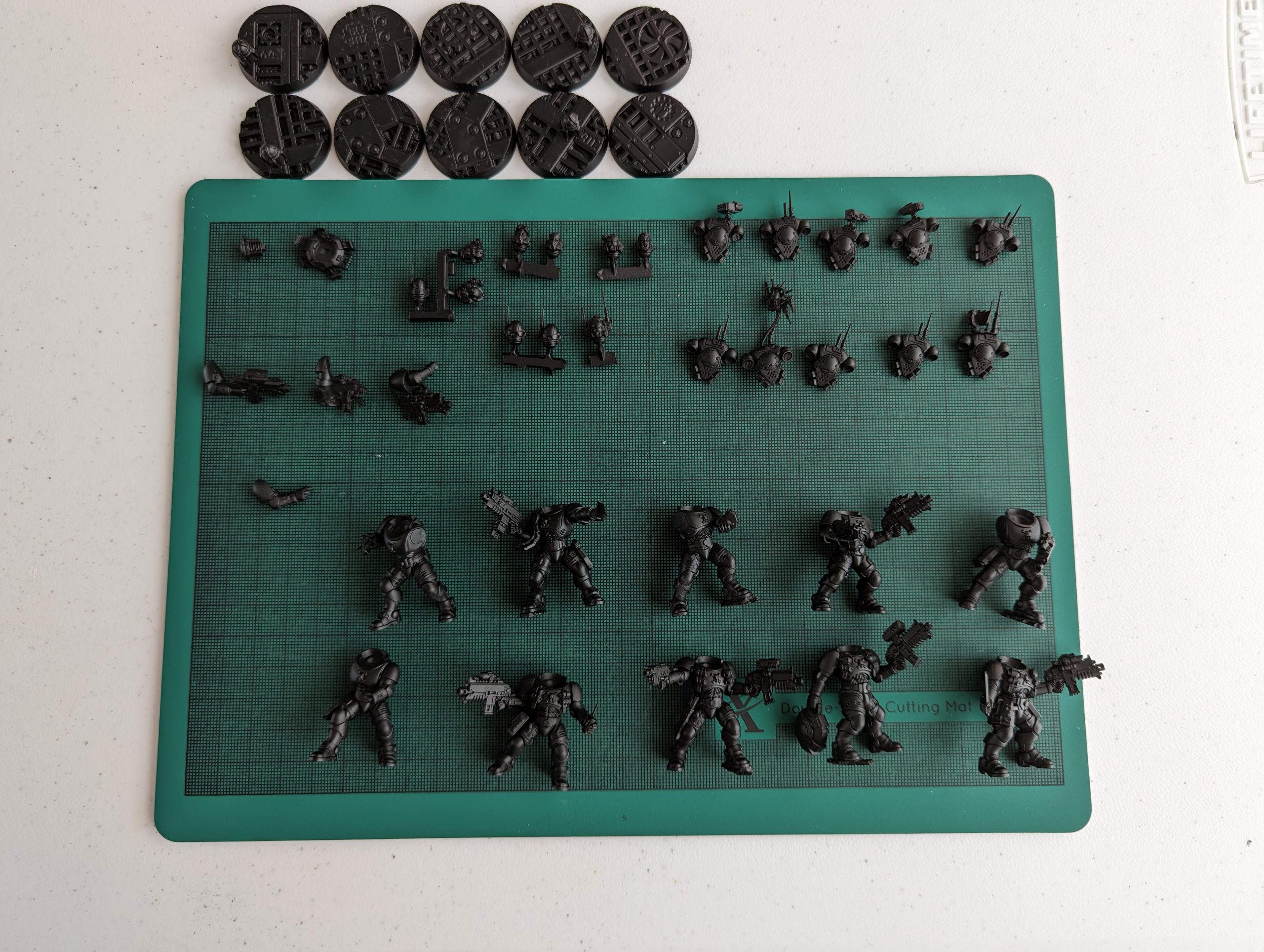 Thundercloud: Here is a picture of my Phobos team undercoated before the UK roasted in hellfire at the start of the week. While I was fairly critical of Phobos in my initial review, I want to make them work for me as a high performing elite team (I think I was a little biased because the Legionary team are so good and flavourful, while Phobos are almost there but not quite, with Reivers needing a little more attention).