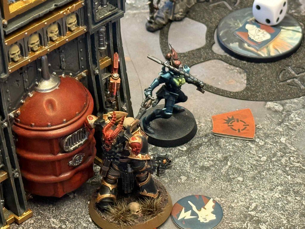It’s still a pretty devastating turn for Matt, who’s already running out of gas. I let Matt go first, taking the extra CP to guarantee a second Vox Scream. He activates his Archsybarite, which I Vox Scream and he pivots to loot the center and guarantee points. I try to get cheeky by shooting his leader with my plasma gun and roll really badly, so the Skinthief ends up having to finish the job anyways. I score for Loot on his objective and my Skinthief bravely stays concealed to run out and loot again on the objective in my territory, continuing to do what I can to deny him shots.