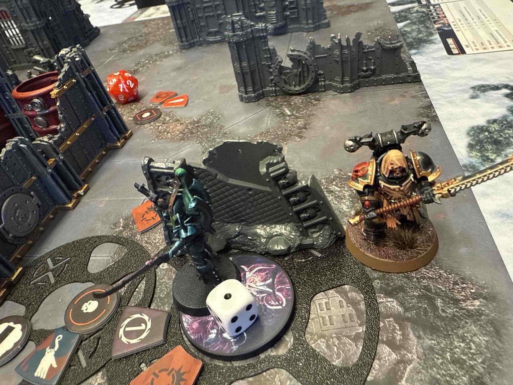 The Skinthief stays concealed behind the heavy cover on Matt’s home objective and toss smoke to obscure the Screecher, so that when I counteract fight with the Screecher I’ll hold the point and be protected against shooting. I counteract fight and pick up the Disciple and score for Storm, then use Vox Scream to prevent his leader from charging on for one more activation so that I can also use the Skinthief to loot. His second Agent charges in to try and soften the Screecher up before also getting murked, and then the Archsybarite charges in and finishes off the Screecher at last, boosting his APL to deny me a second point for Storm and picking up two points on his tac op, Confirm Kill.