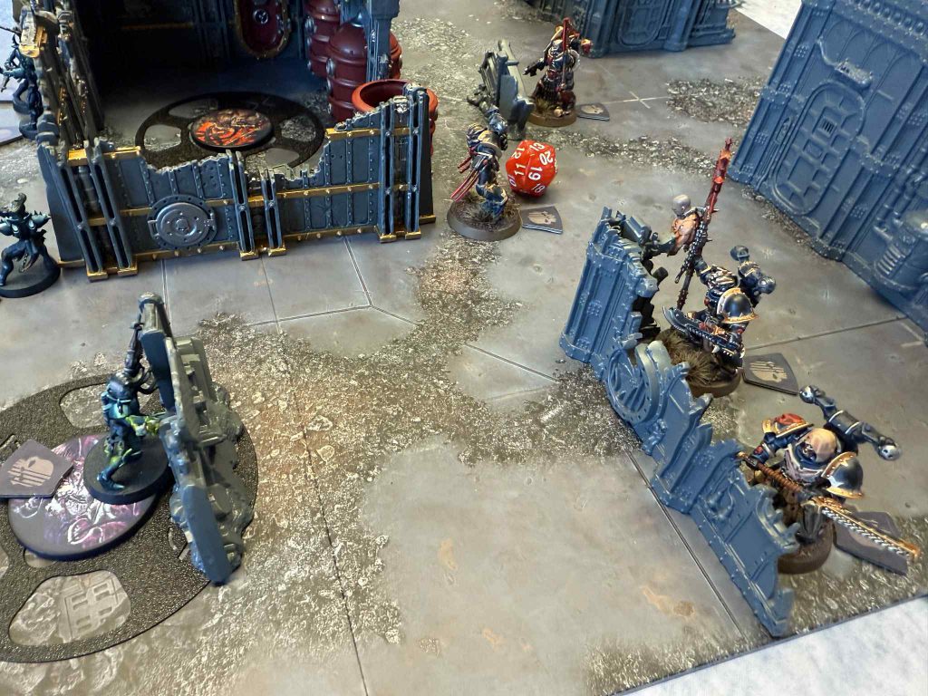 The Fearmonger happily uploads for more points, and I take a shot with my Heavy Gunner’s Missile Launcher that sadly does very little. Andrew moves up close enough to be on the center and turn off In Midnight Clad, and his Rokkit shot puts me at one hp on the gunner. I swap my Visonary’s order to engage, to threaten counteract shooting, and shuffle up with my leader and open the door to the objective room in Andrews home. I’m careful to do so without eating Guard shooting from his leader. Andrew then moves his Demolisha up to threaten my Visonary with a charge next turn, but he stays in LoS, and I oversharge my plasma pistol to put some serious hurt on the Demolisha. It’s a weight off my shoulder, since I can now feasibly charge and kill him without giving Andrew an opportunity to blow up his hammer and take us both out.