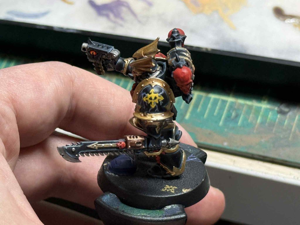 The momentum from the heavy gunner spilled into my decision to paint a bespoke Nemesis Claw warrior for the team, instead of just using one of my other Legionnaires to fill the role of “dude with chainsword.” If I was having fun before with the Gunner, but the Warrior the kind of absolute blast to paint that comes with the perfect union of high hobby energy on a cool looking model. I was having such a good time, in fact, that I allowed myself to get carried away. I just waxed poetic about how the lightning looks cool on the Night Lords, why not try to freehand some myself? And while we are out here in freehand town, hey, lets paint the Black Legion icon on this guy's pauldron too. In for a penny, in for a pound.