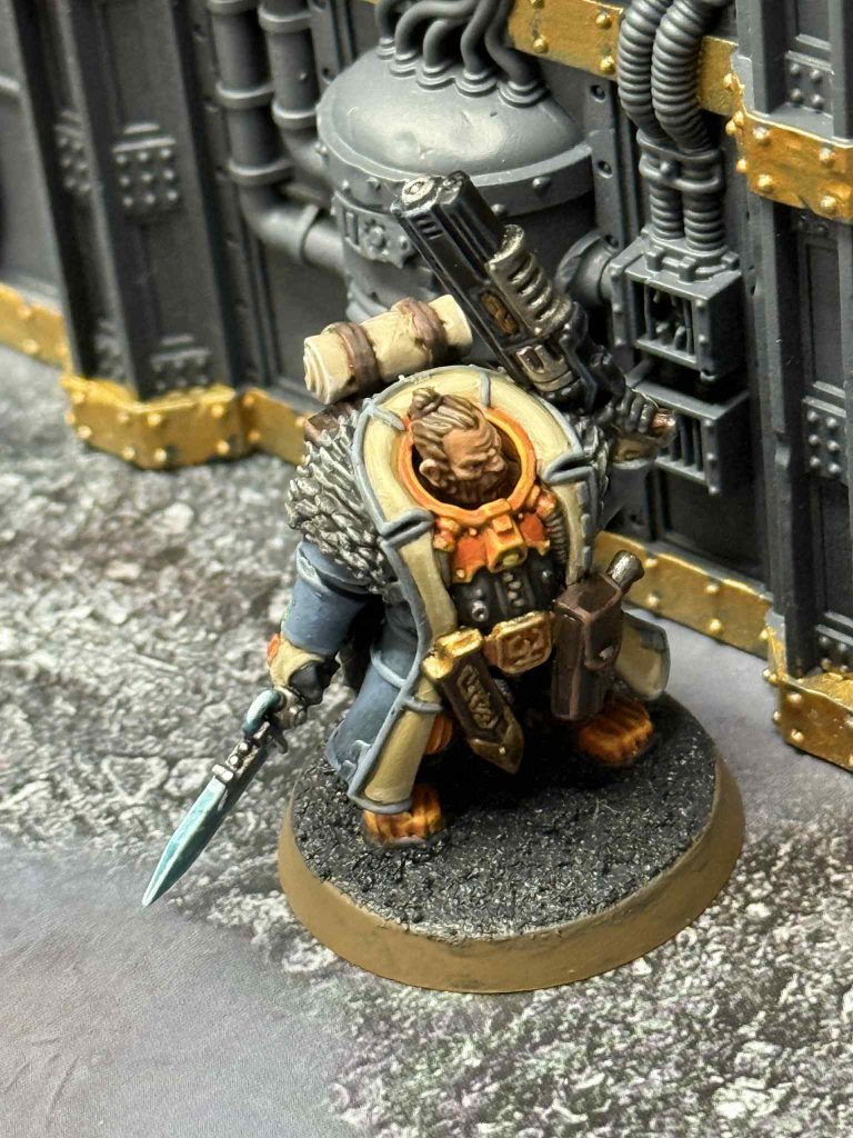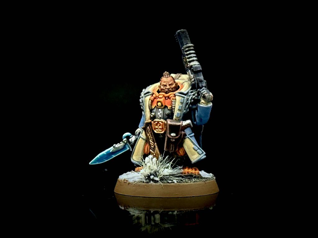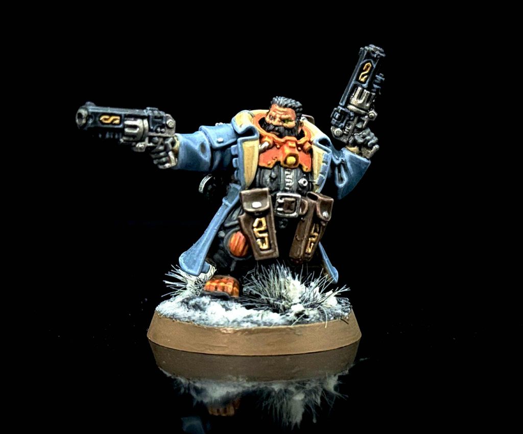 The coats are by far the coolest part of the Yaegir model, and the part that I’m happiest about with my end result. I really like the contrast of the cool blue against the bright orange, which looks much better to me than if I were to stick with a classic brown or black coat. I painted the coat by basing with Thunderhawk Blue, followed by a spot wash of Agrax Earthshade in the folds of the coat. I highlighted with Wolf Grey, followed by a careful highlight of Gravestone Blue, trying to make sure it doesn’t overpower the first highlight and blends well. The result came out just as I wanted it to.