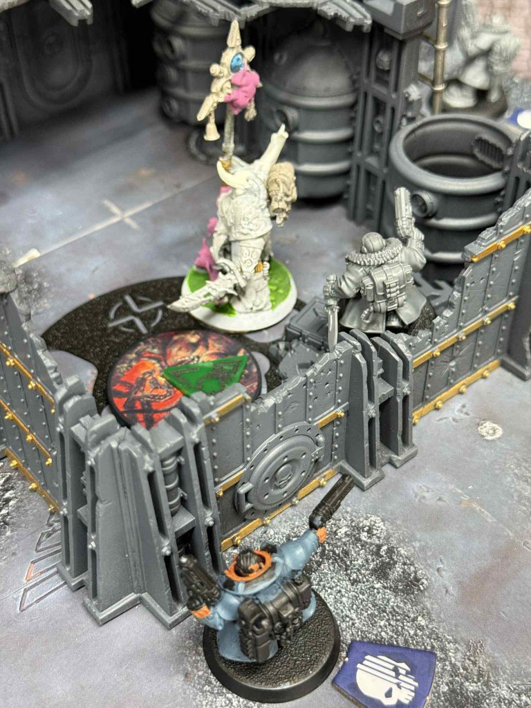 I win the roll off on TP, and I elect to go first. Chris has an operative in a key spot to charge and cause problems in the center room, and then plenty of trouble right behind him if I take the bait. I activate my Bladekyn and then use Bonds that Bind to activate my Gunner as well. I give the Bladekyn a resourceful point so she can open the door, charge, and kill the Corsair all while I get a point for Storm Objectives, while putting the gunner on guard. The gunner on guard turns out to be a huge problem for Chris, who’s reluctant to commit anything to the room now in fear of getting blasted.