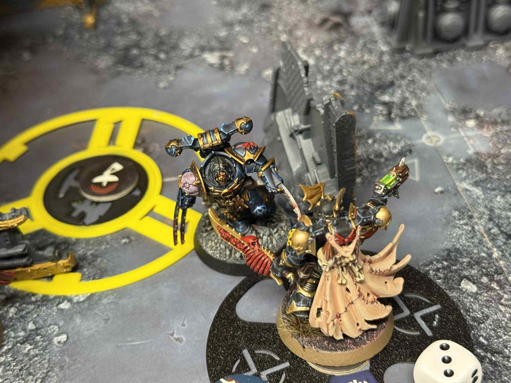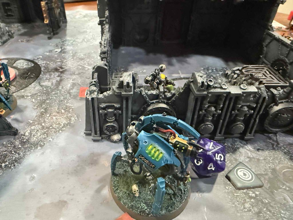 Aiden’s placed one of his Macrocyte Warriors up a little too far to be on his own Matrix, and it leaves him open to a long charge from my Skinthief that he forgot was hidden behind the stronghold. If Aiden had used Cryptogravic Repulsion, I wouldn’t have even been able to make the charge, but since he wasn’t thinking about it he didn’t think he needed to use it. I charge in with the Skinthief, take out the warrior, put my Grisly Trophy on the Skinthief to make him even tankier, and then use Proclivity for Murder to charge into his Canoptek Crawler with the Transdimensional Isolator. I fight the Crawler for good measure and even manage to take it below half. With his next activation, he tries to fall back with the crawler, but since I took chain snares all I need is a lucky 4+ to keep him stuck in combat.