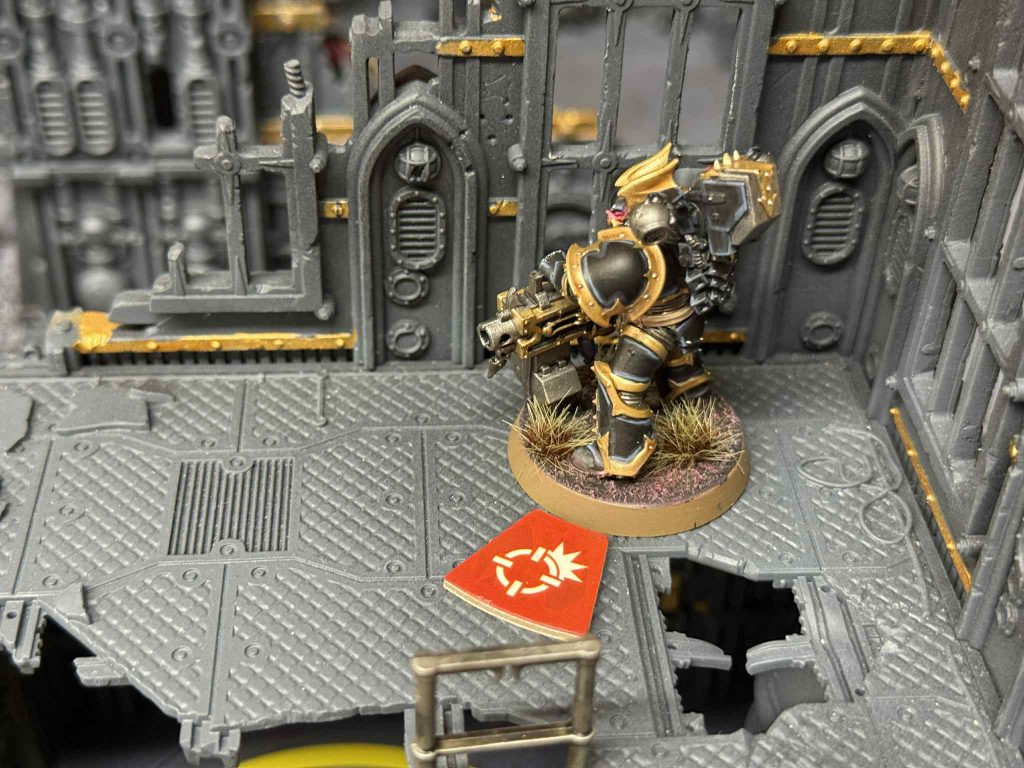 This comes up pretty quickly, as at the end of TP one when we’ve both creeped up the board I realize that my Ventrilokar can make a play on his Venomspitter sitting on the Volkus Stronghold Vantage near a window. I take the initiative, and push my Ventrilokar into the open to force his Venomspitter to swap to Engage, and then I Vox Scream his attempt to activate him and move the operative to safety. I then use my heavy gunner to try and take the Ravener down while I have the chance, but alas I come up short, leaving the operative with just six wounds remaining. The Venomspitter heals up and takes some shots on the Ventrilokar, nearly killing him, and finishes him off with a charge from his Prime. My Visionary makes one last ditch effort to kill the Venomspitter to no avail, so I opt to earn some points on Implant instead.